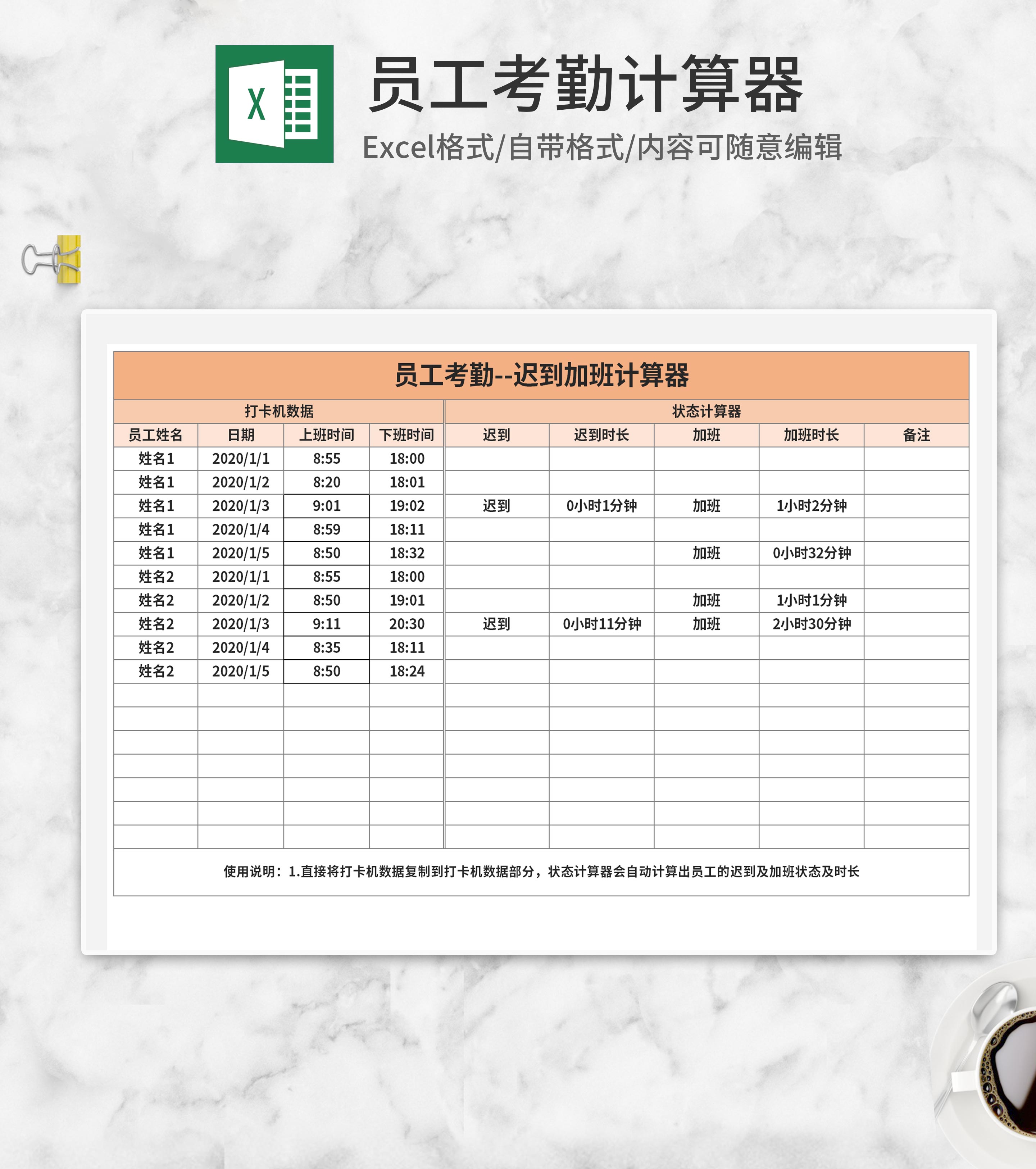 绿色员工加班考勤计算器Excel模板