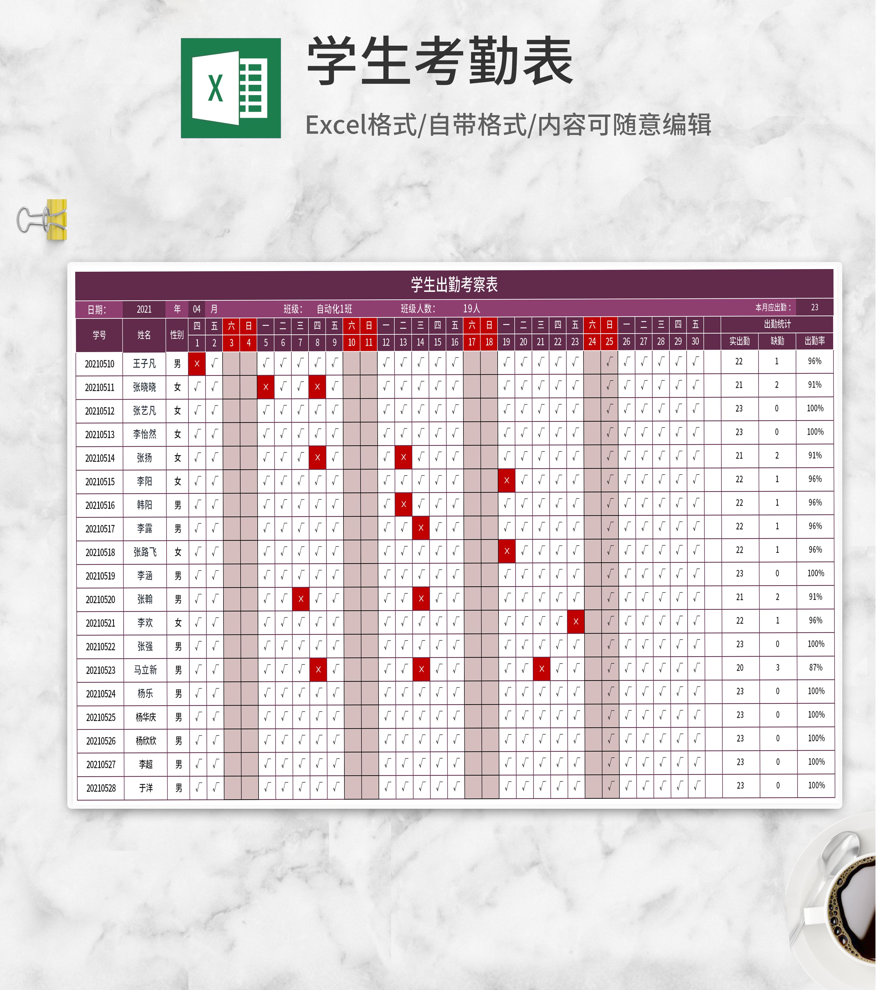 红色学生出勤统计表Excel模板
