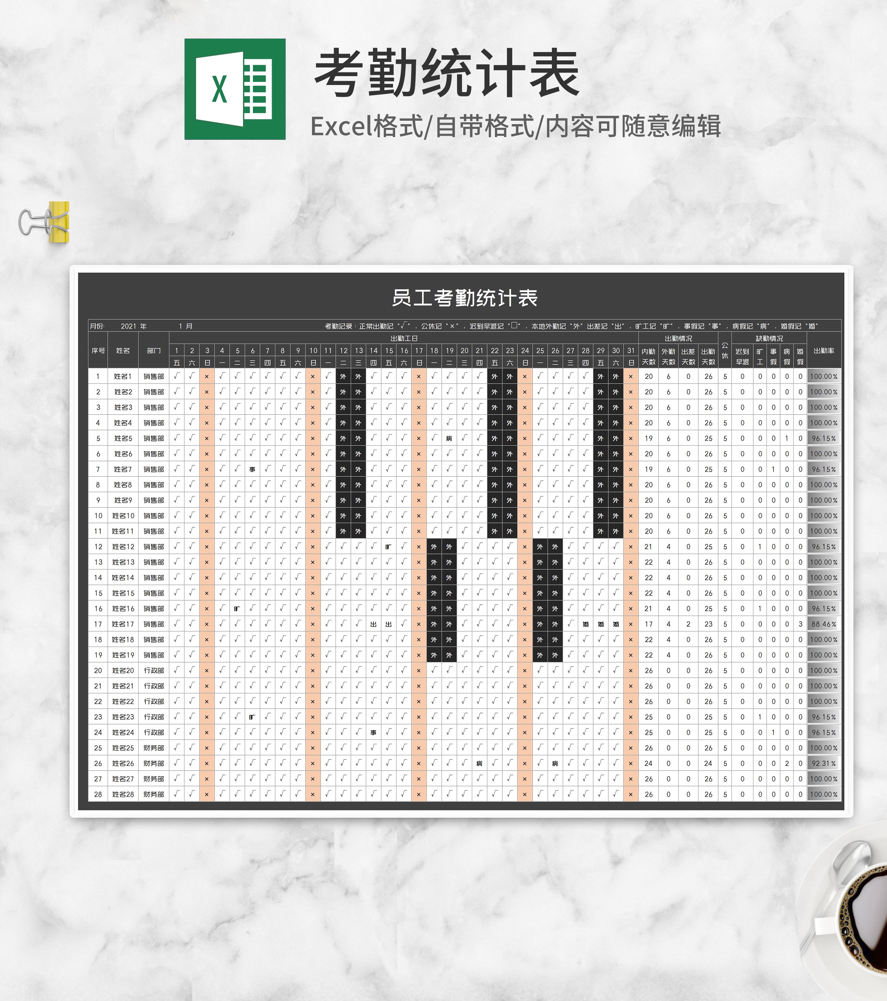 员工出勤考勤统计表Excel模板