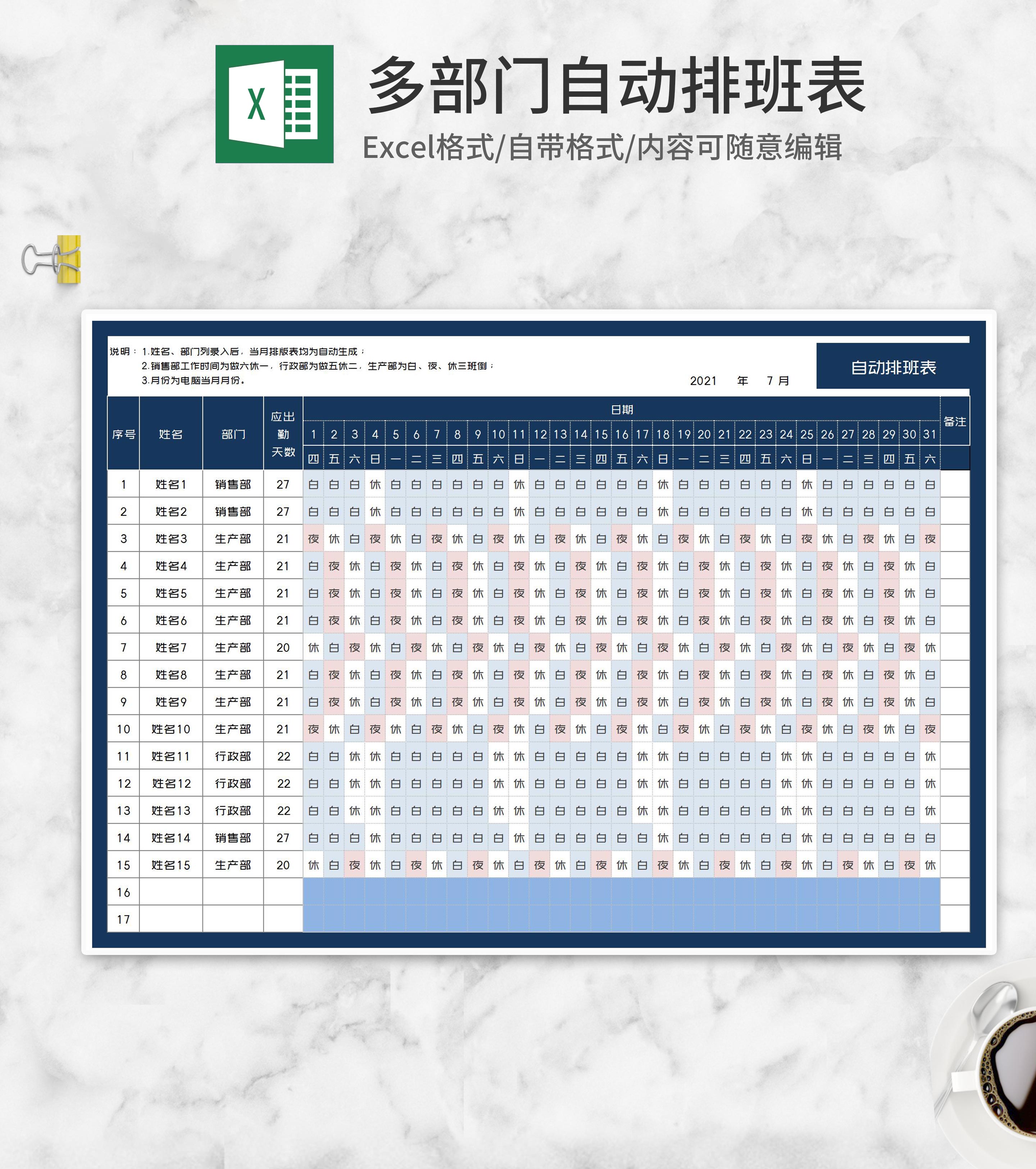 多部门自动排班表Excel模板
