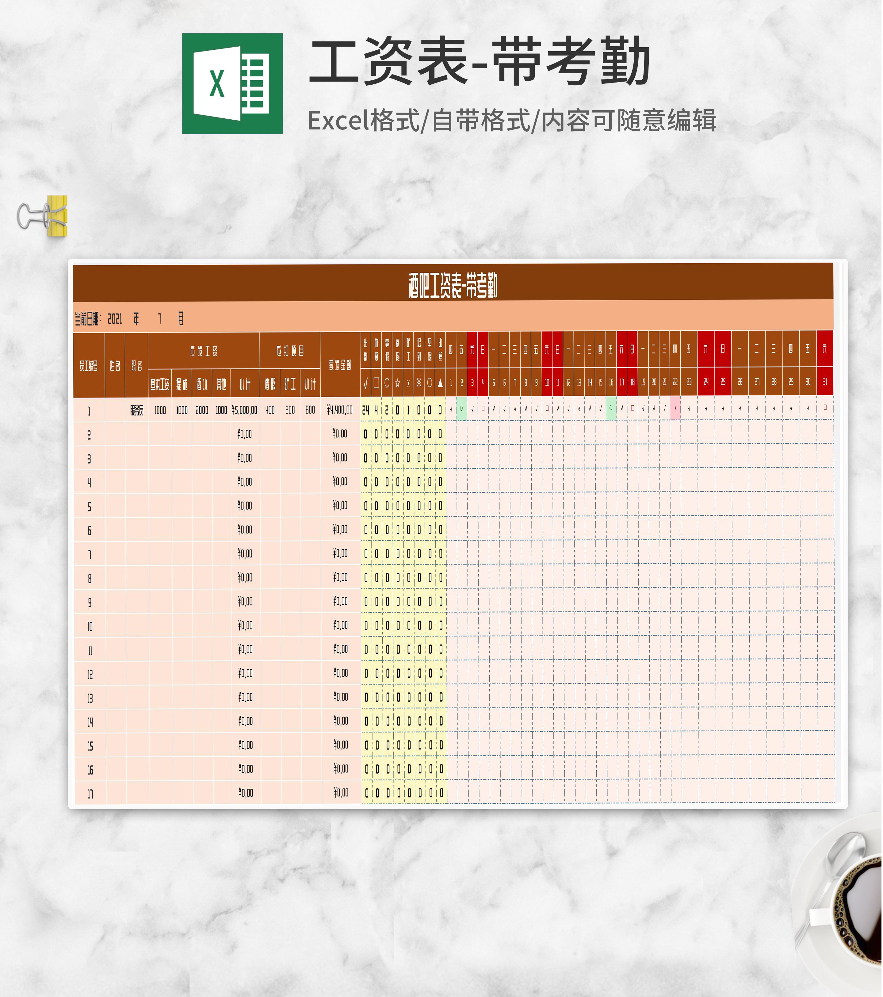 酒吧员工工资考勤明细表Excel模板