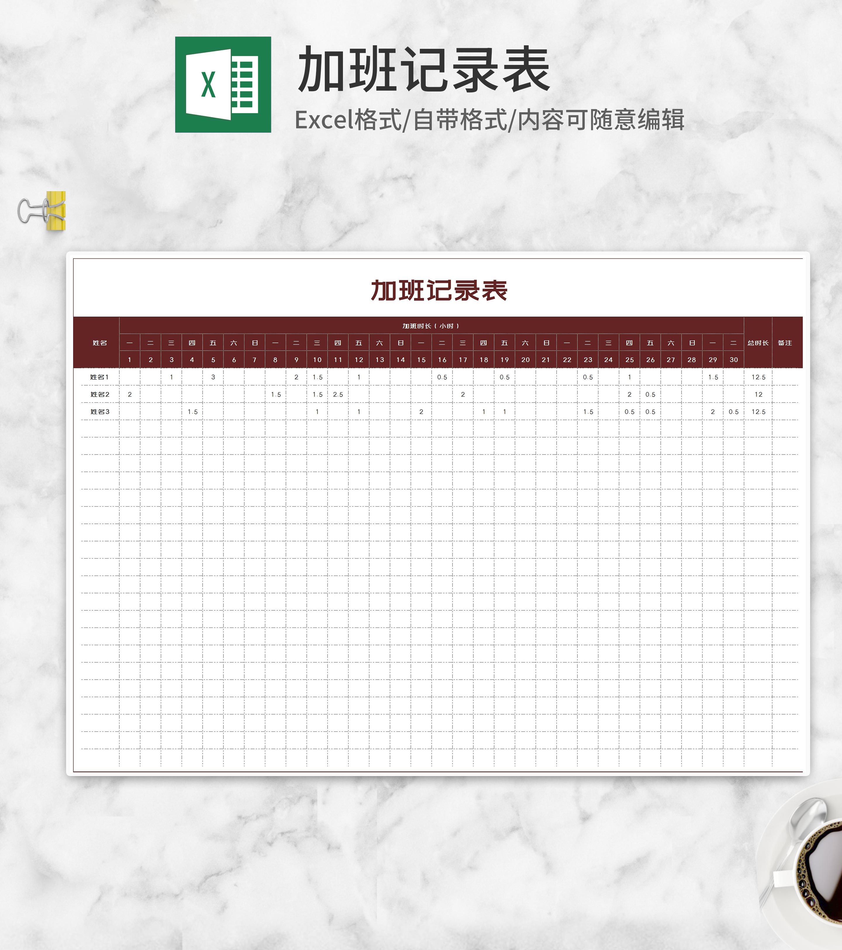 月度员工加班记录表Excel模板