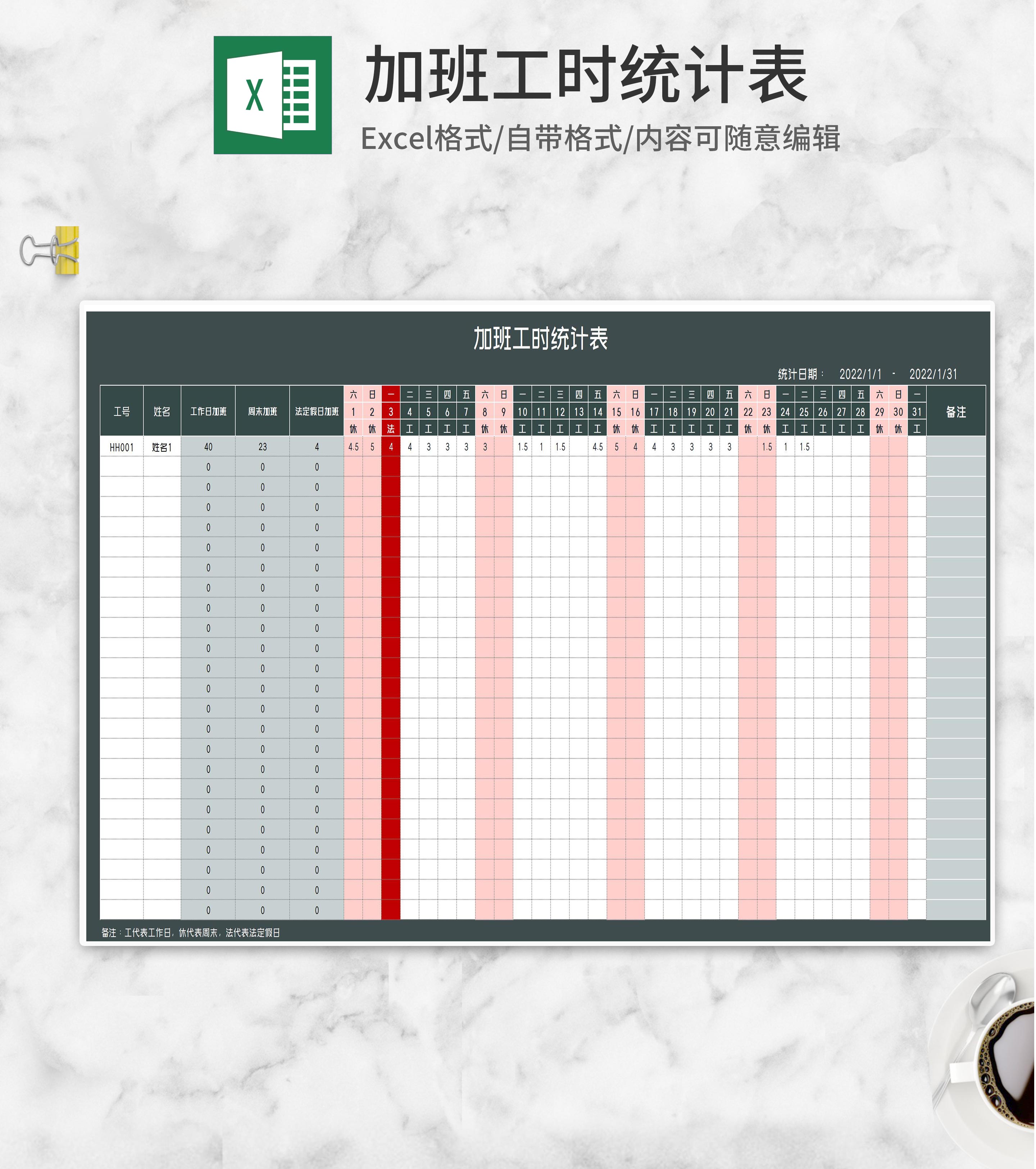 员工加班工时统计表Excel模板