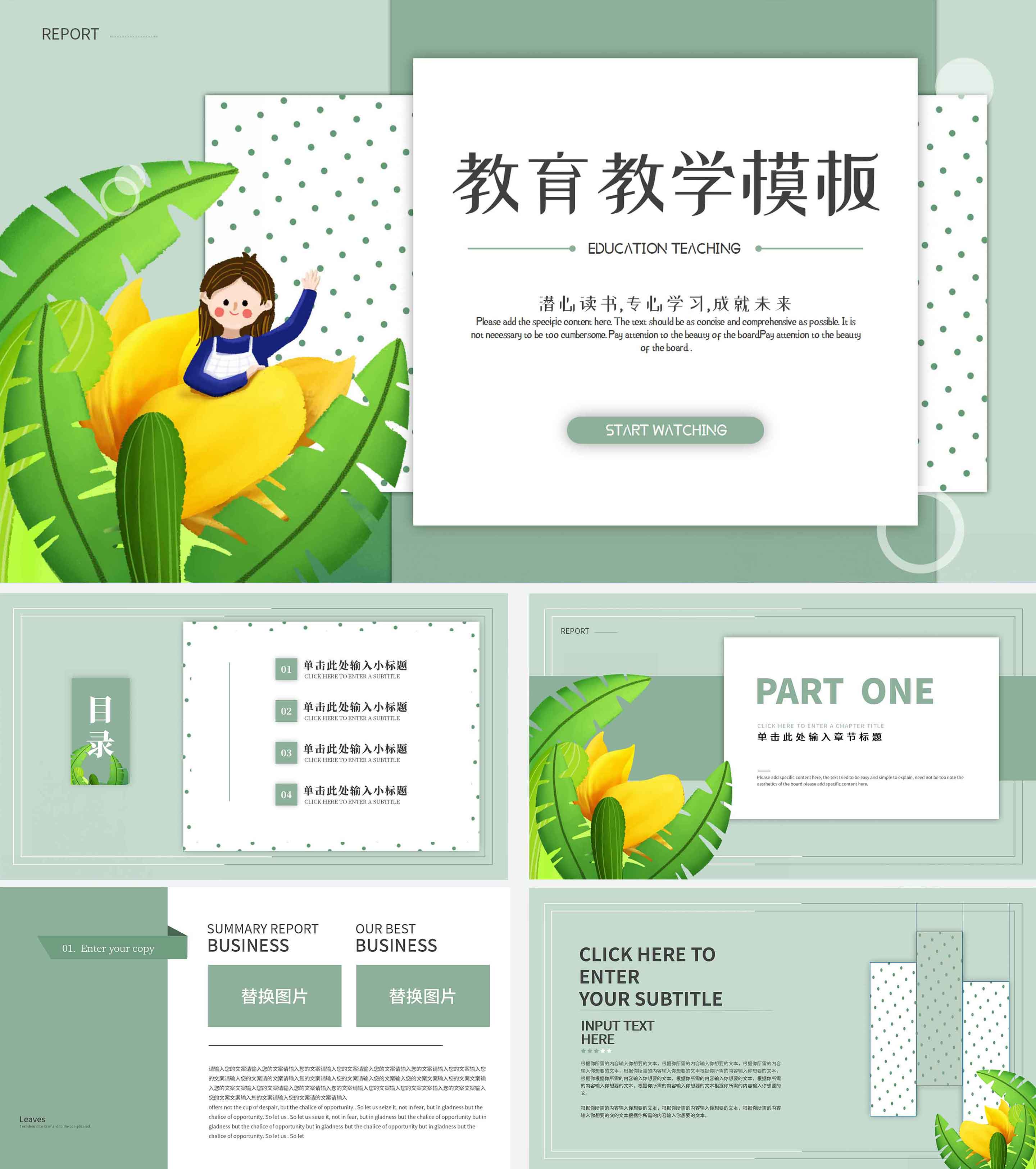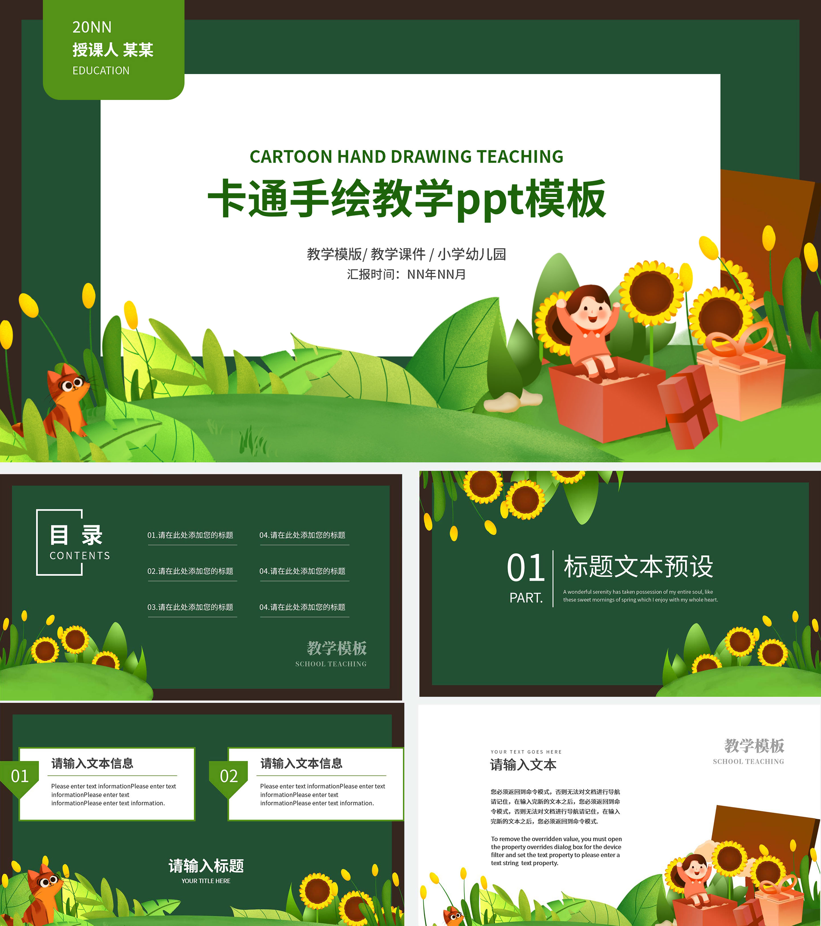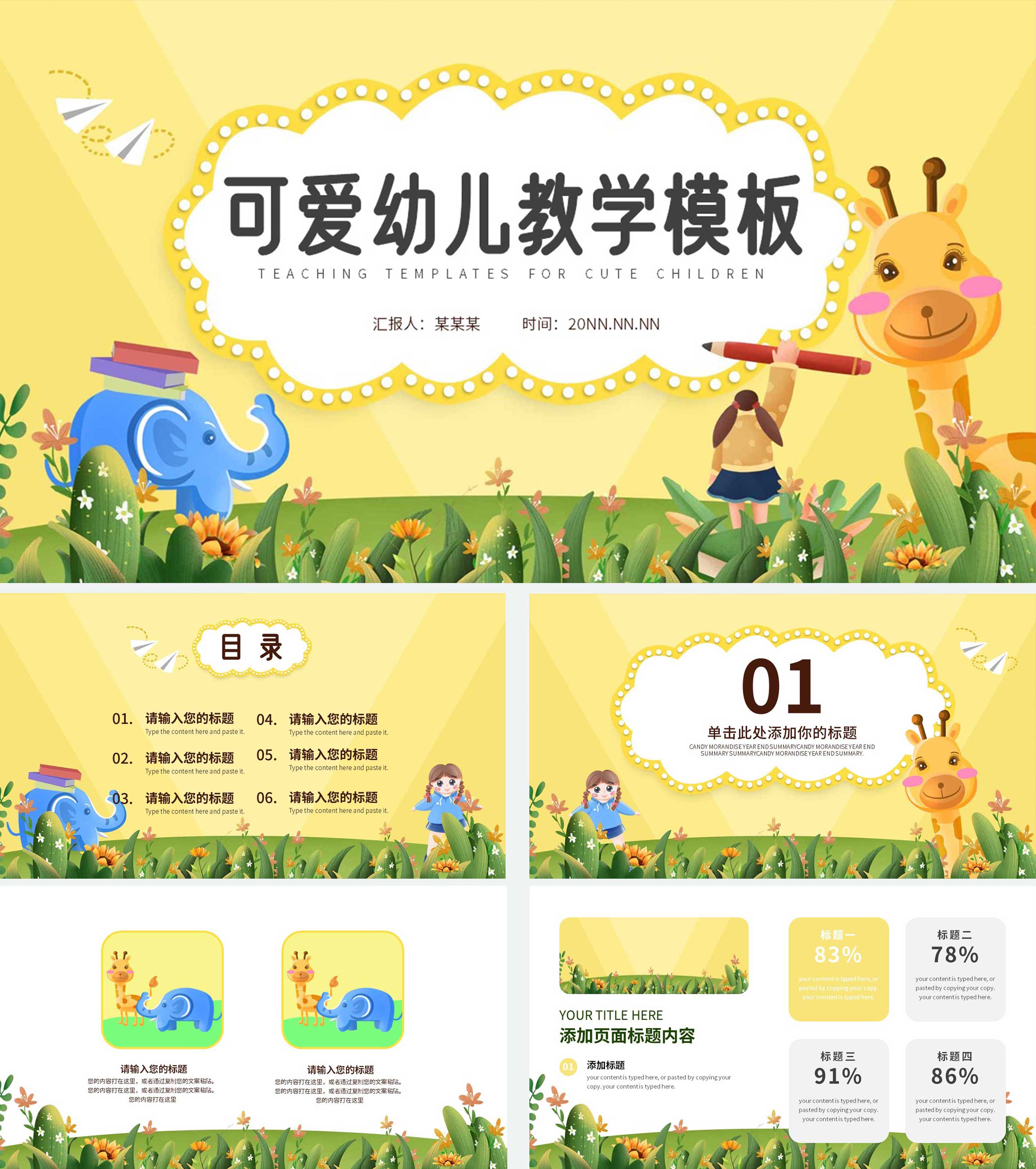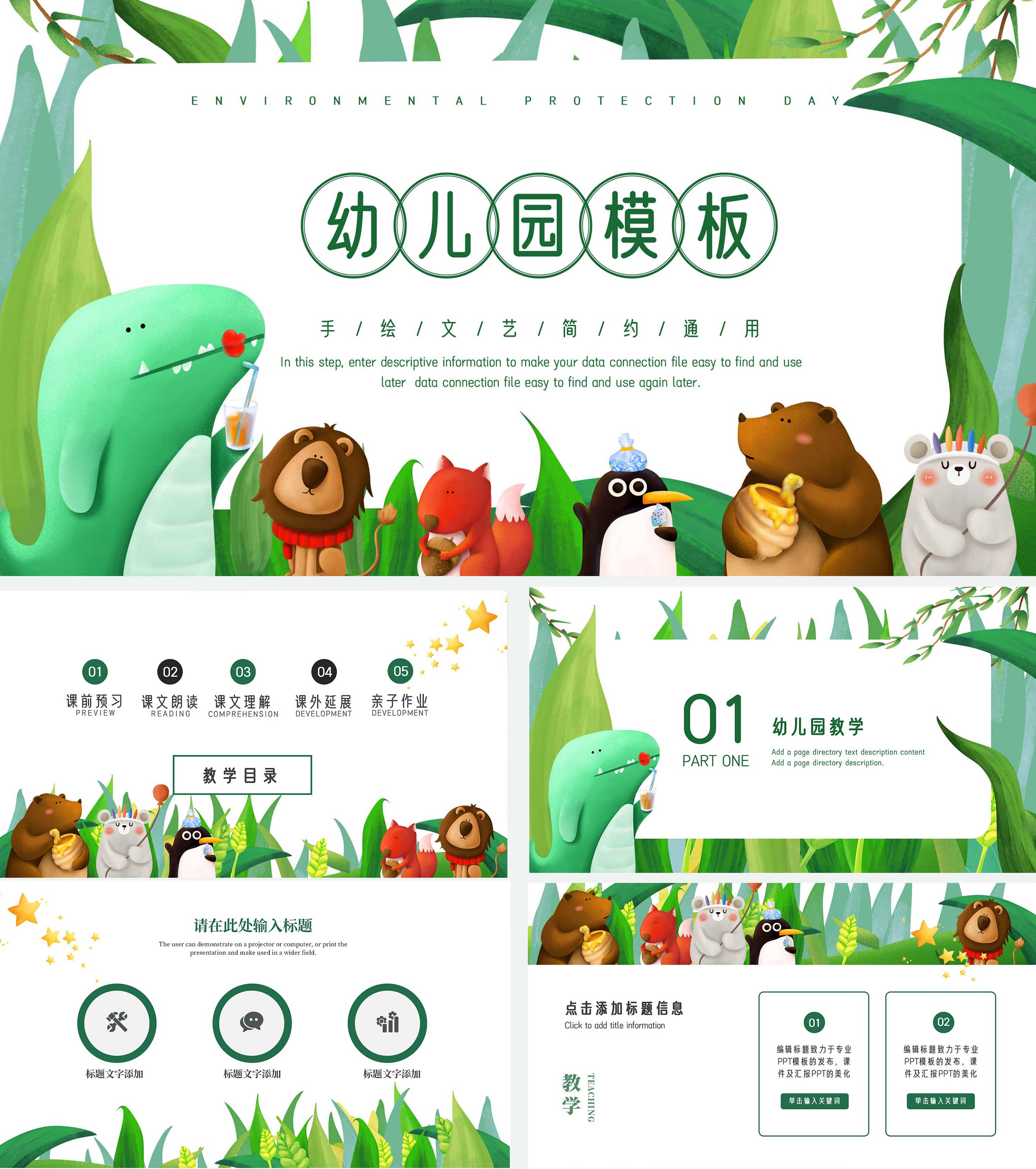 绿色文艺简约卡通小动物幼儿园PPT模板