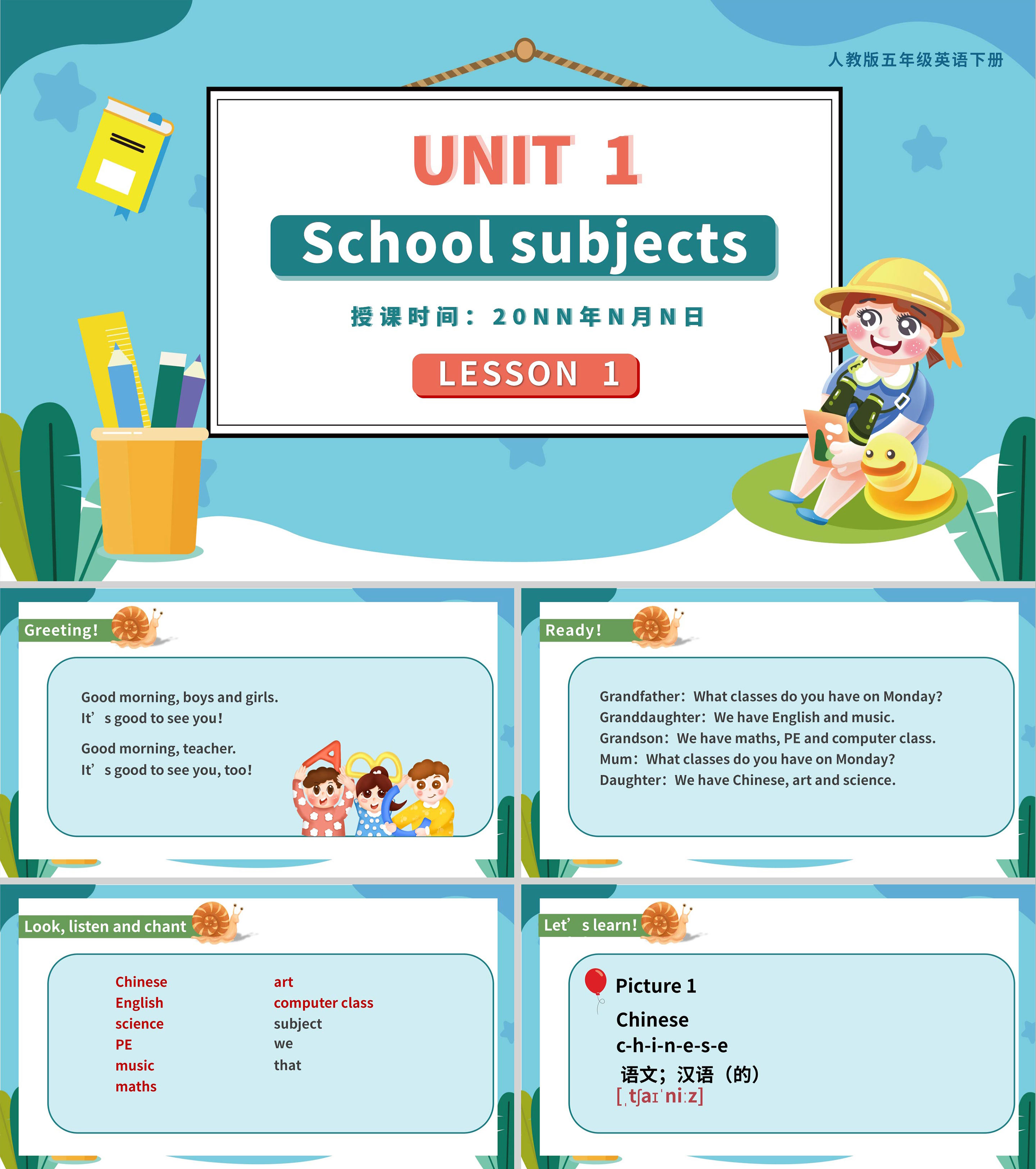 蓝色卡通风五年级英语下册PPT课件