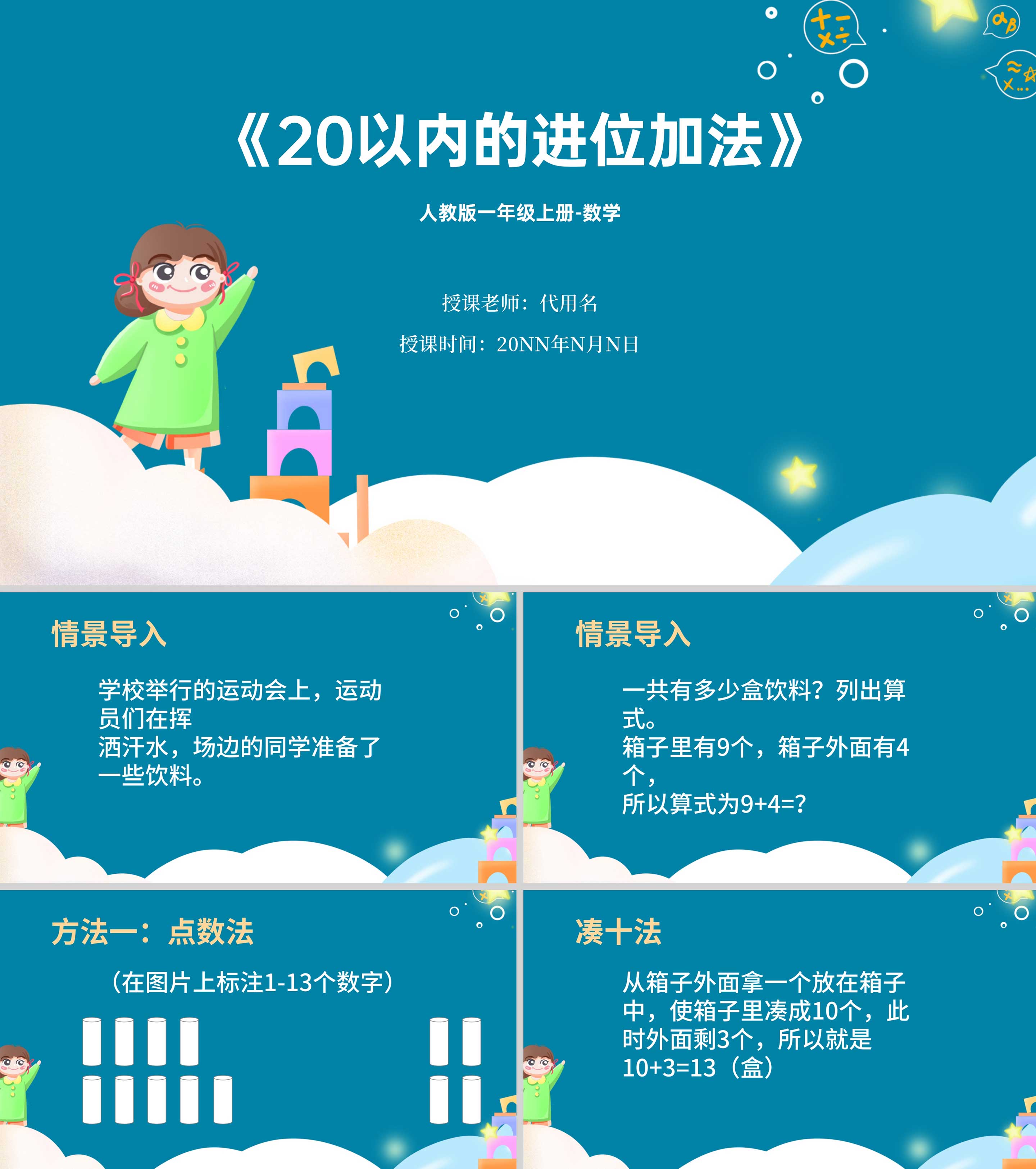 蓝色卡通风一年级上册数学20以内进位加法PPT课件
