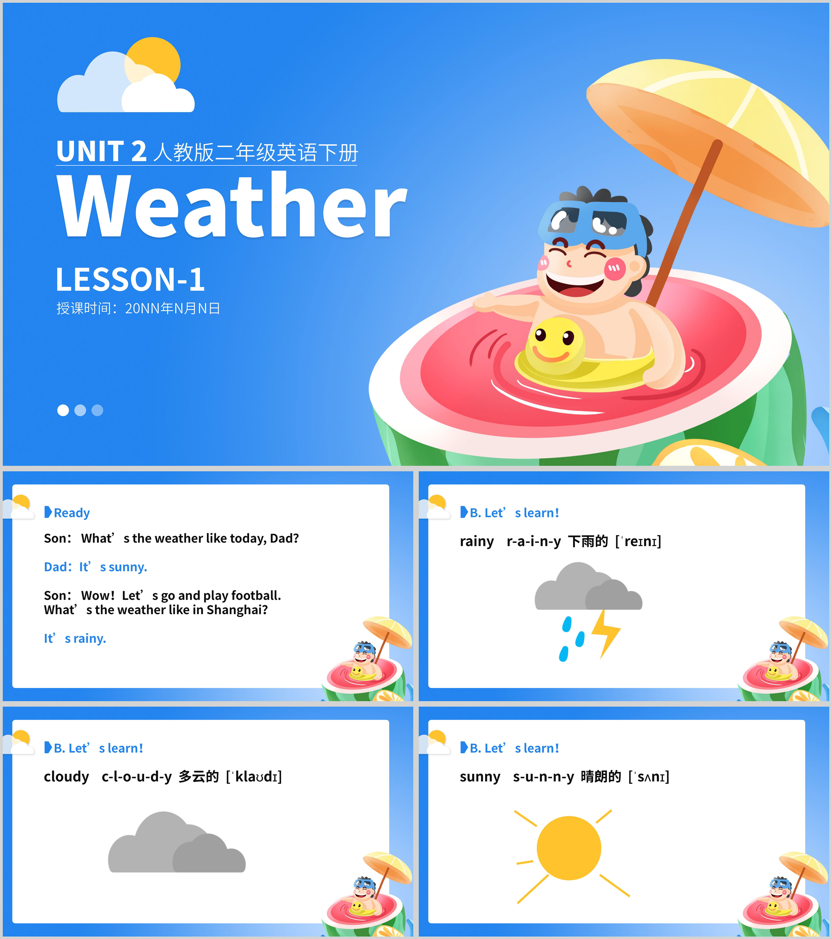 蓝色清新夏日二年级英语下册课件PPT模板