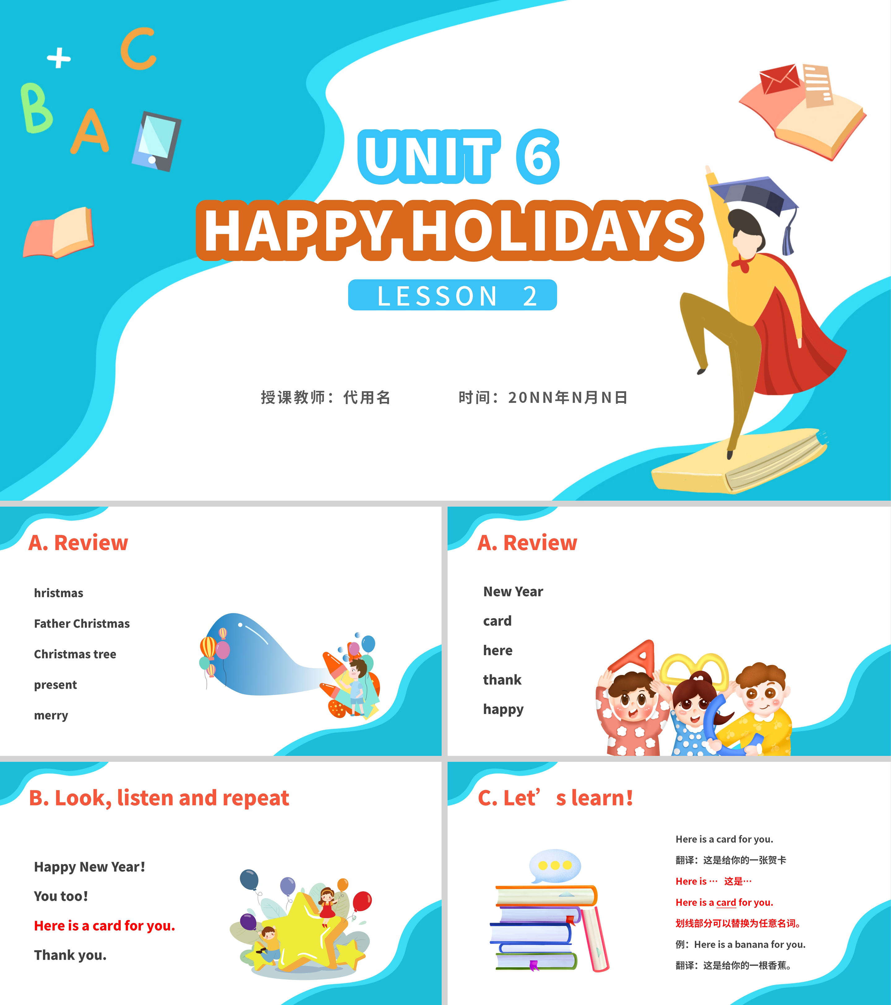 蓝色卡通二年级英语《Happy Holidays》课件PPT模板