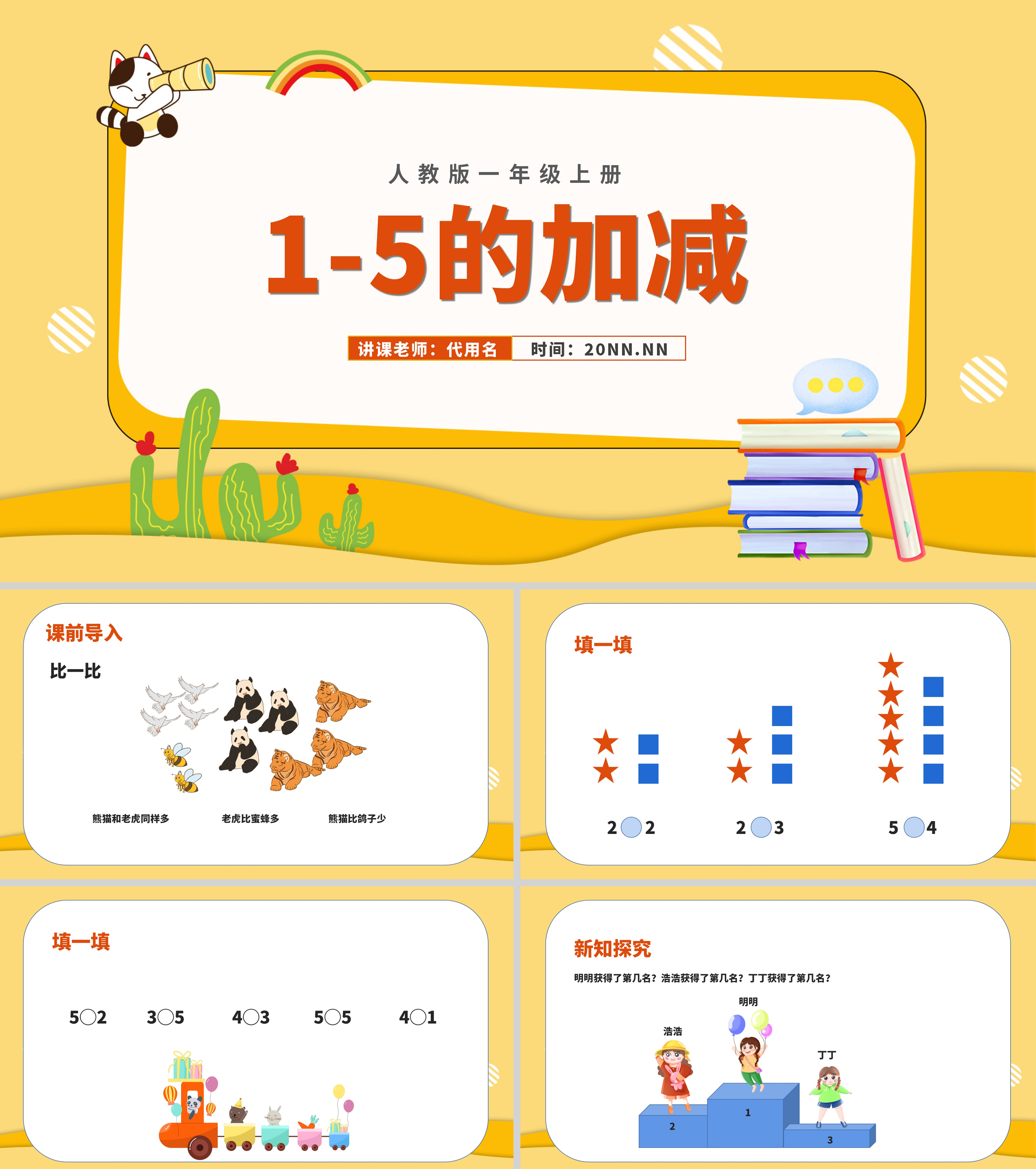 黄色扁平风一年级数学1-5的加减PPT课件