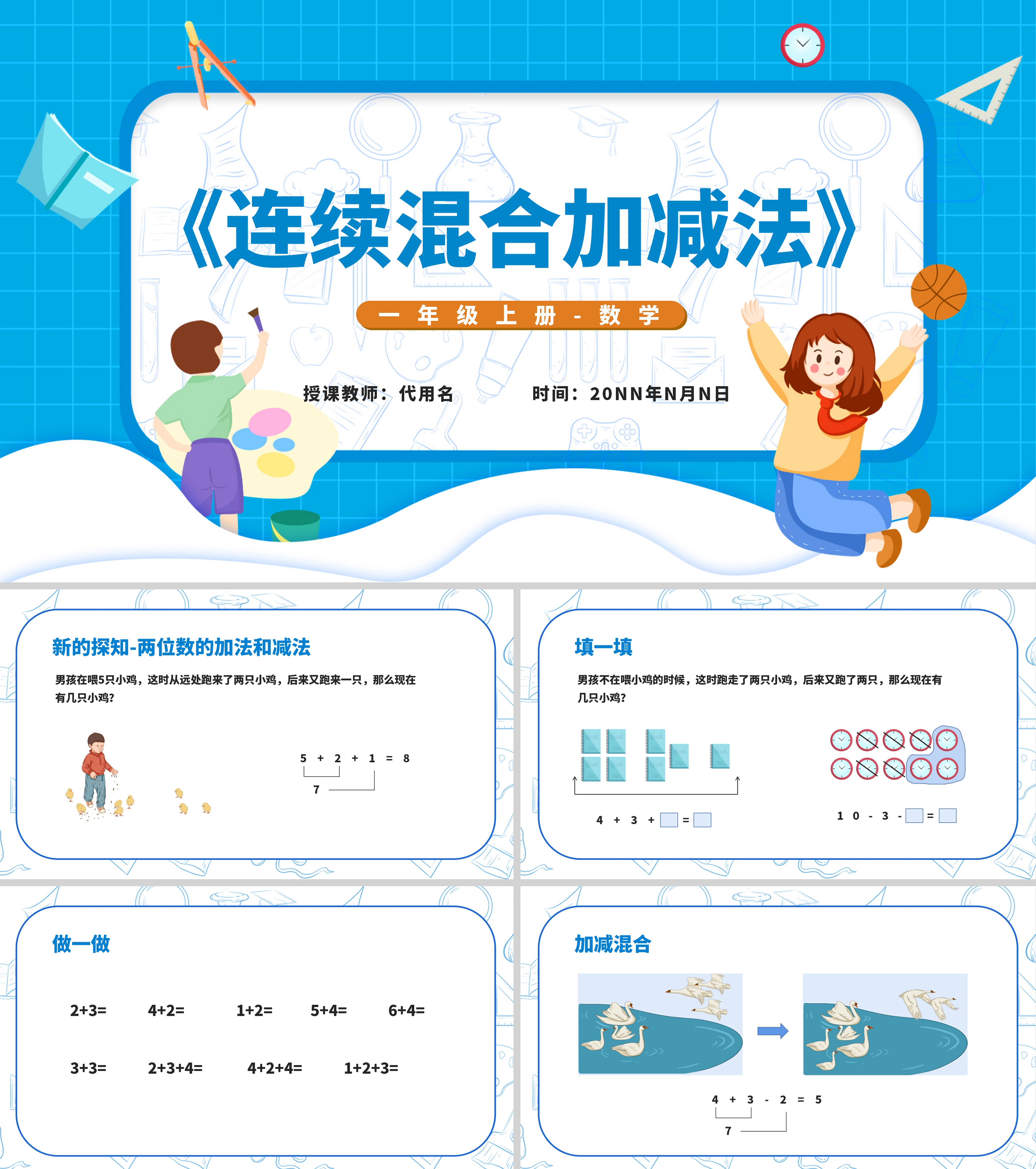 蓝色扁平风一年级数学连续混合加减法PPT课件