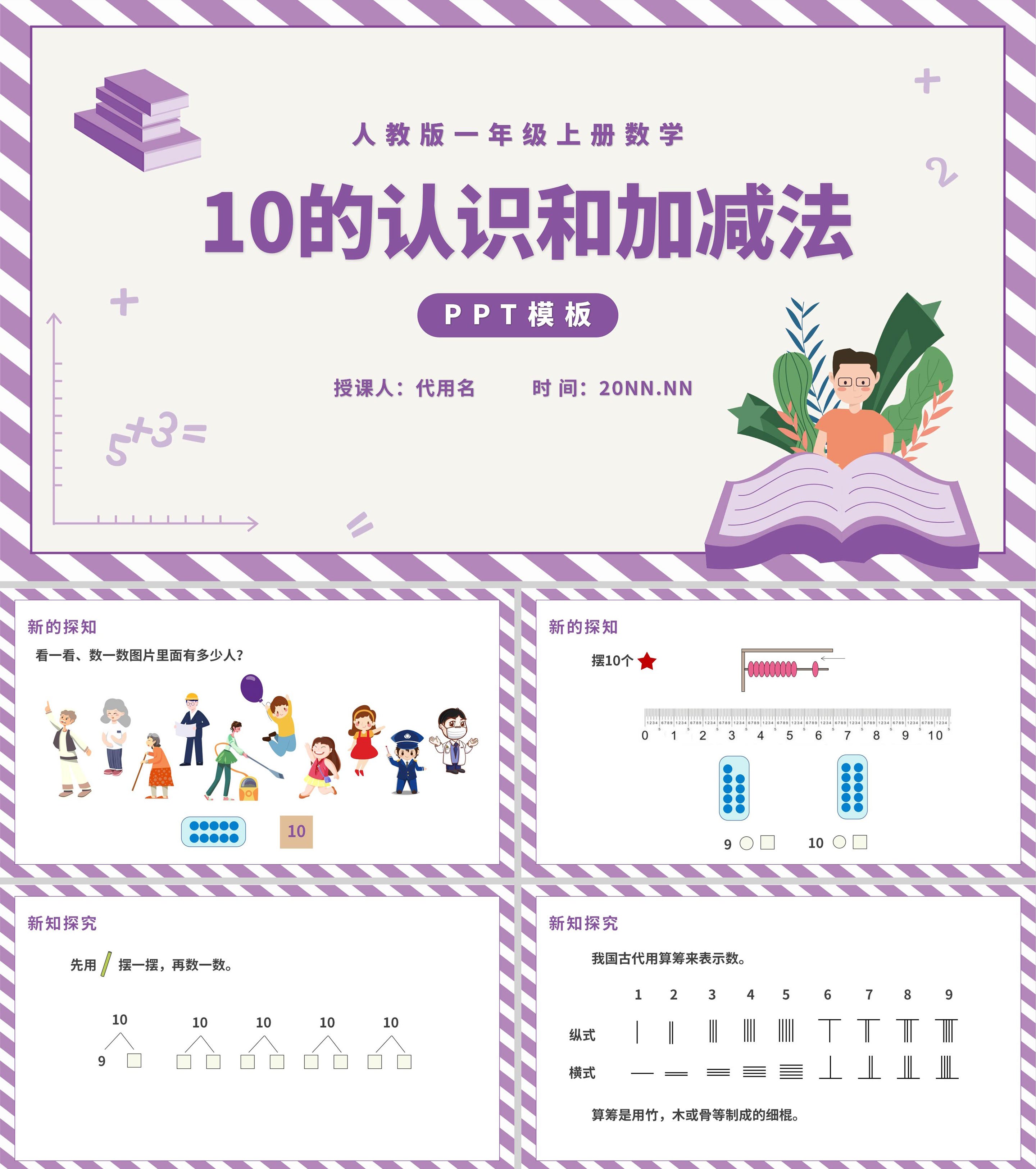 紫色一年级《10的认识和加减法》课件PPT模板