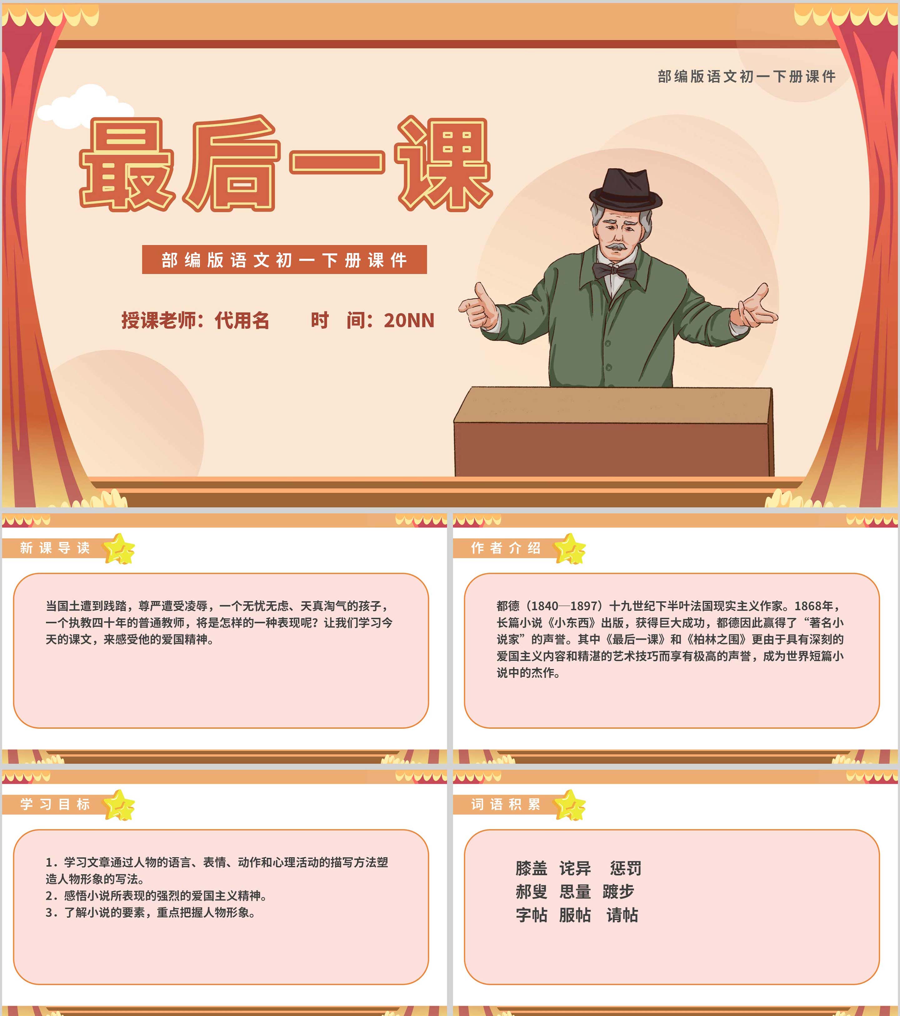 红色卡通风语文初一下册最后一课教学课件PPT模板