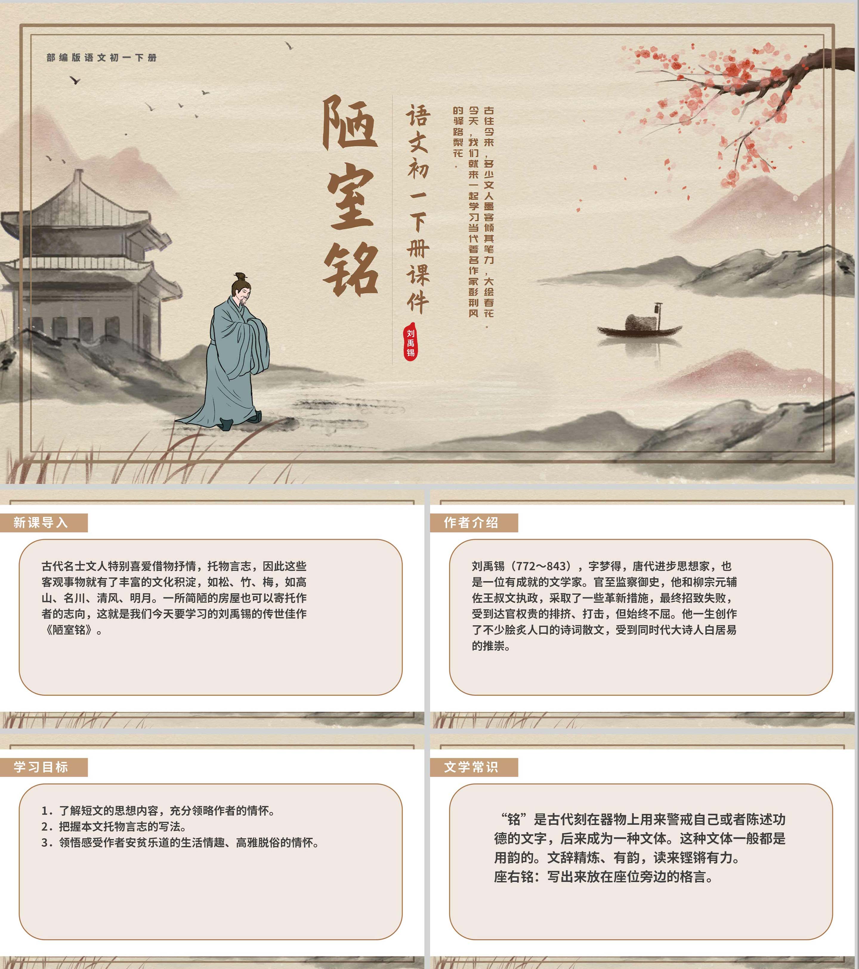 黄色中国风传统古风文言文陋室铭教学课件PPT模板