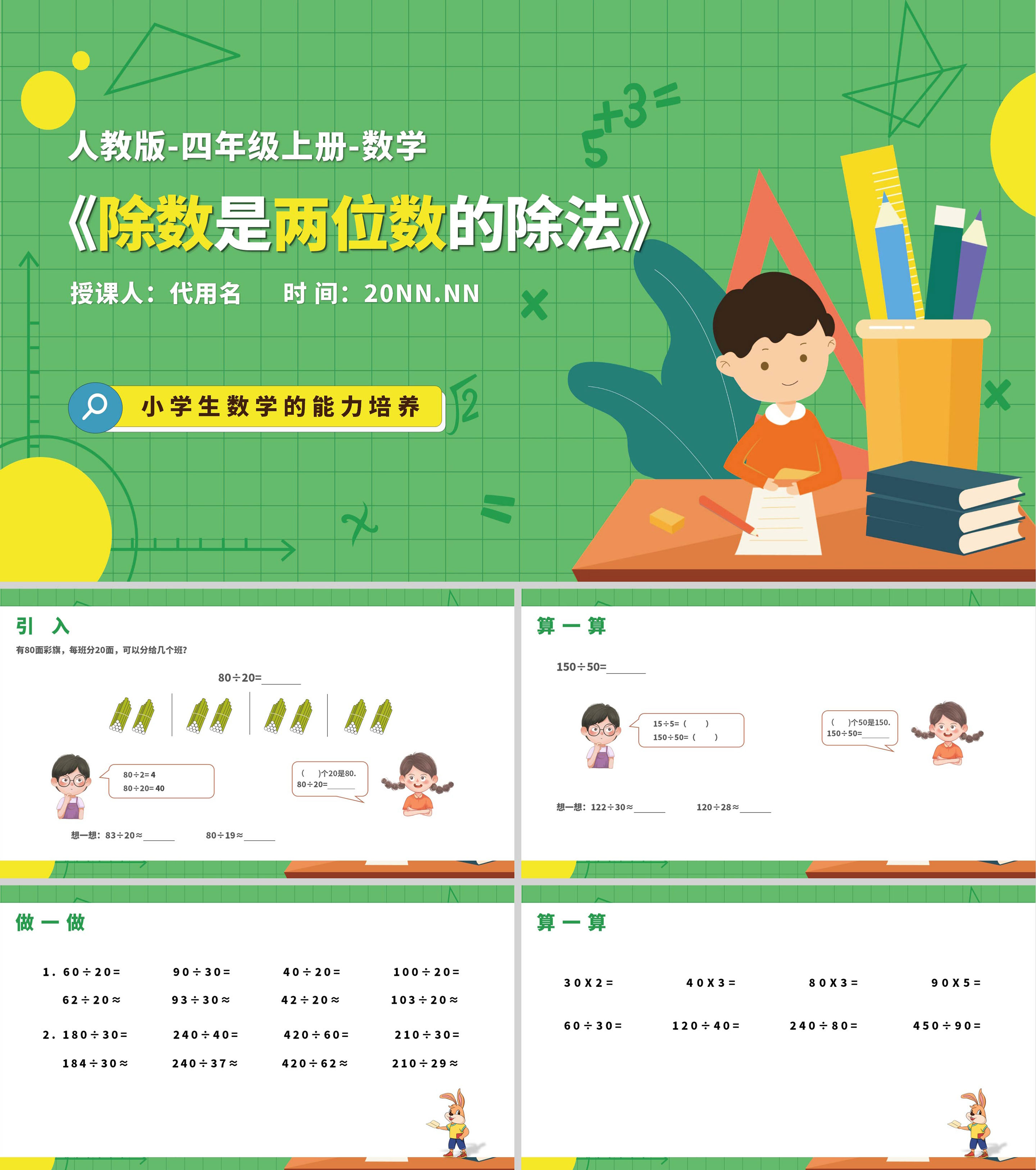 绿色卡通风四年级上册加减乘除数学教学PPT课件