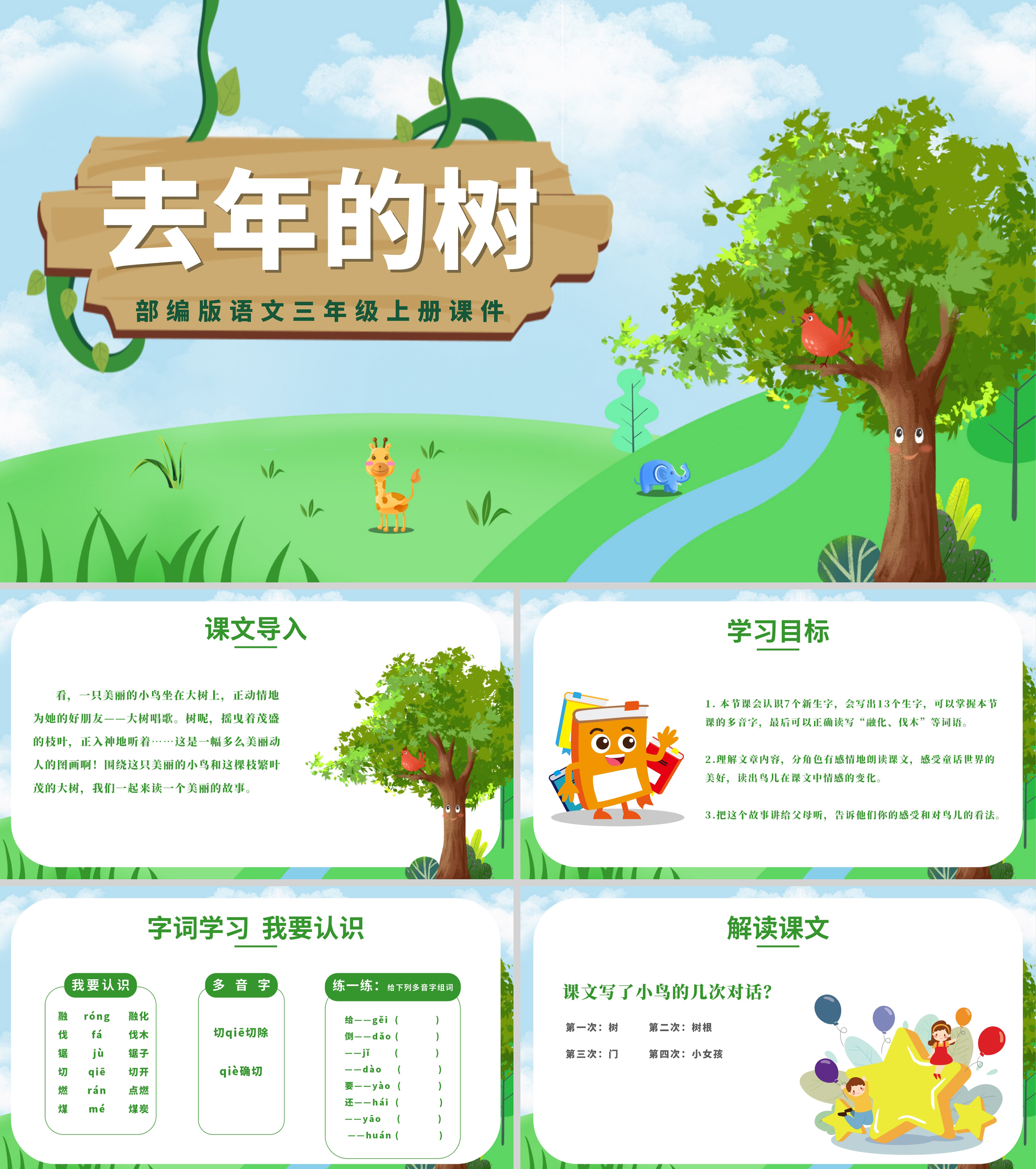 绿色卡通风小学语文去年的树拼音课件PPT模板