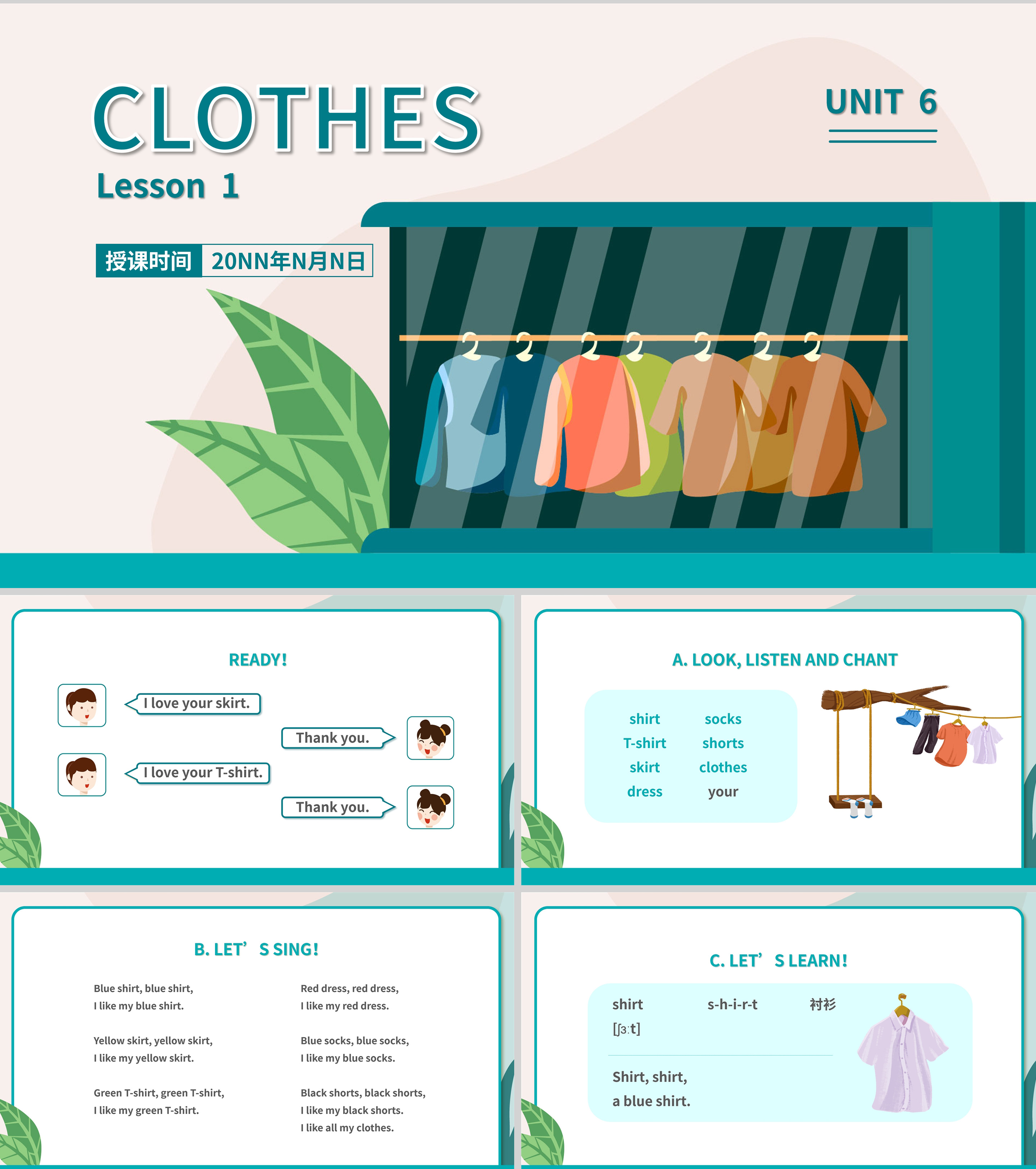 简约一年级英语下服装教学课件PPT模板