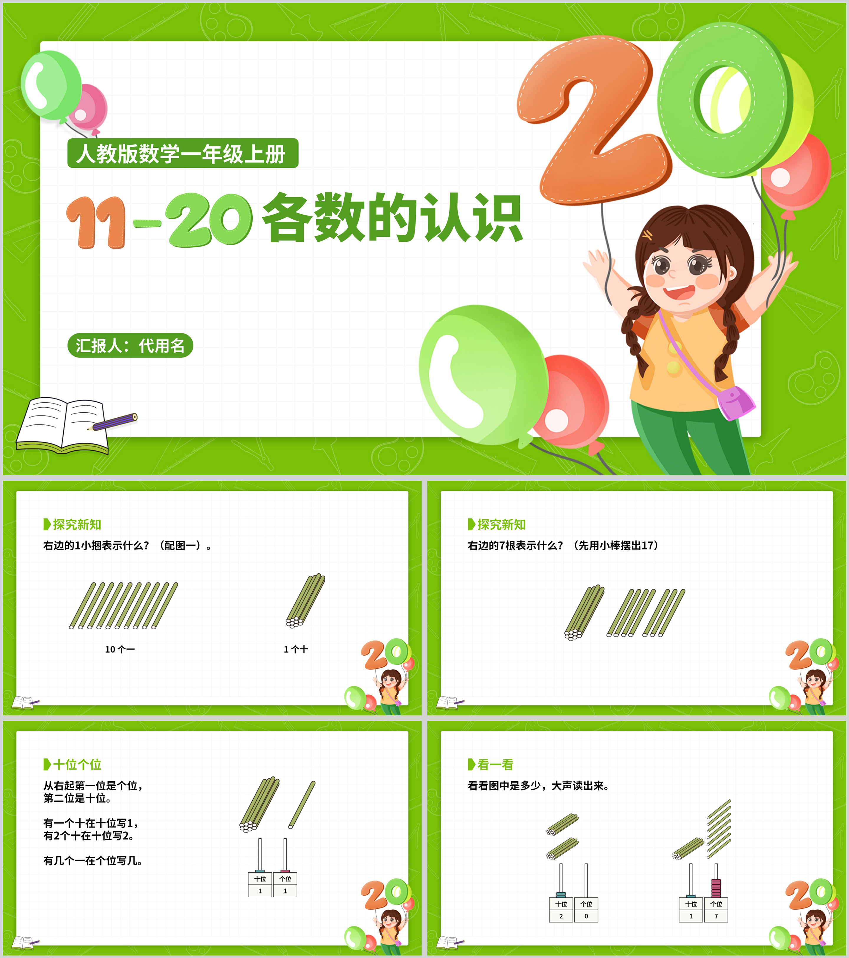 可爱卡通绿色各数的认识课件PPT模板