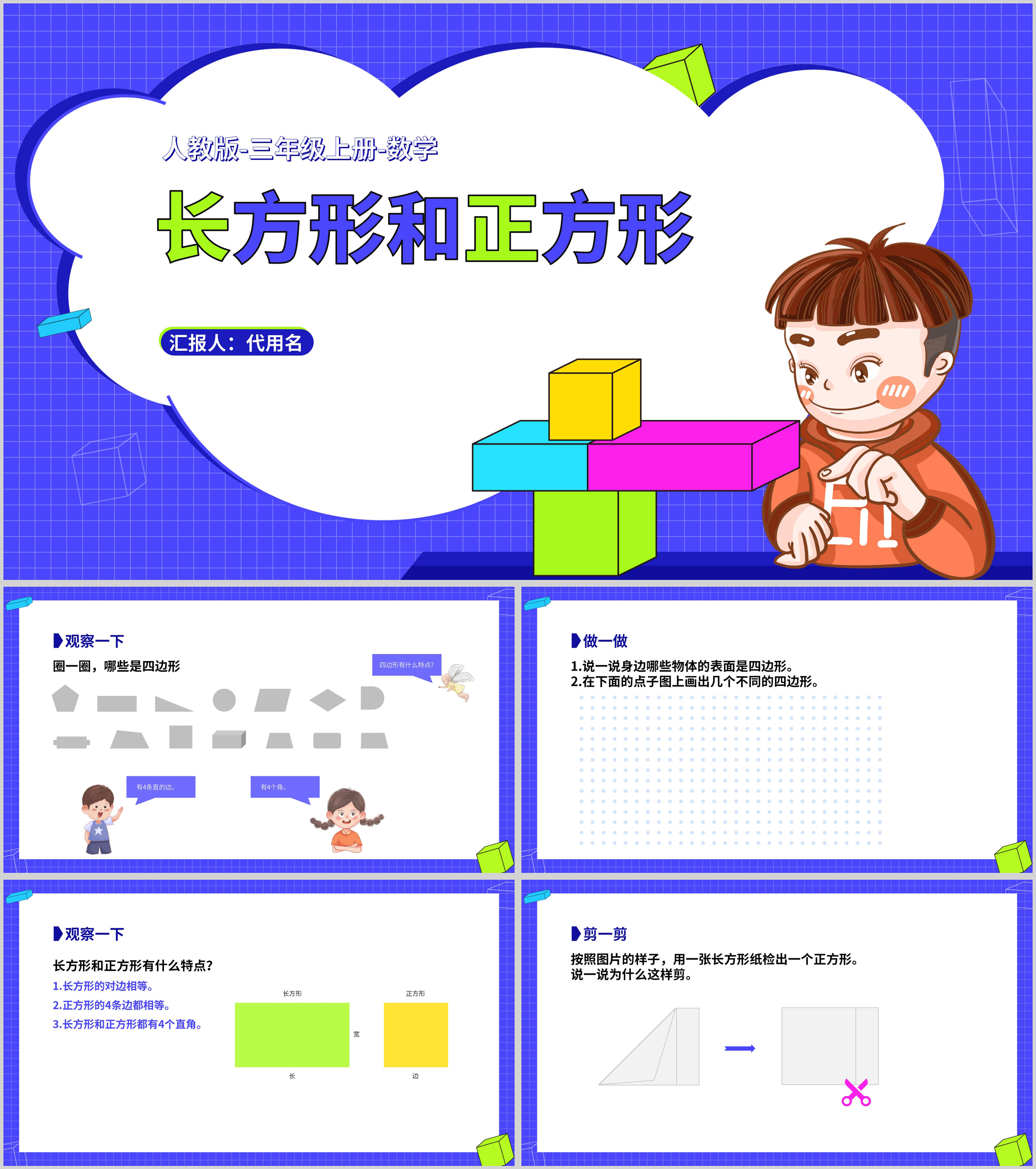 卡通三年级数学《长方形和正方形》课件PPT模板