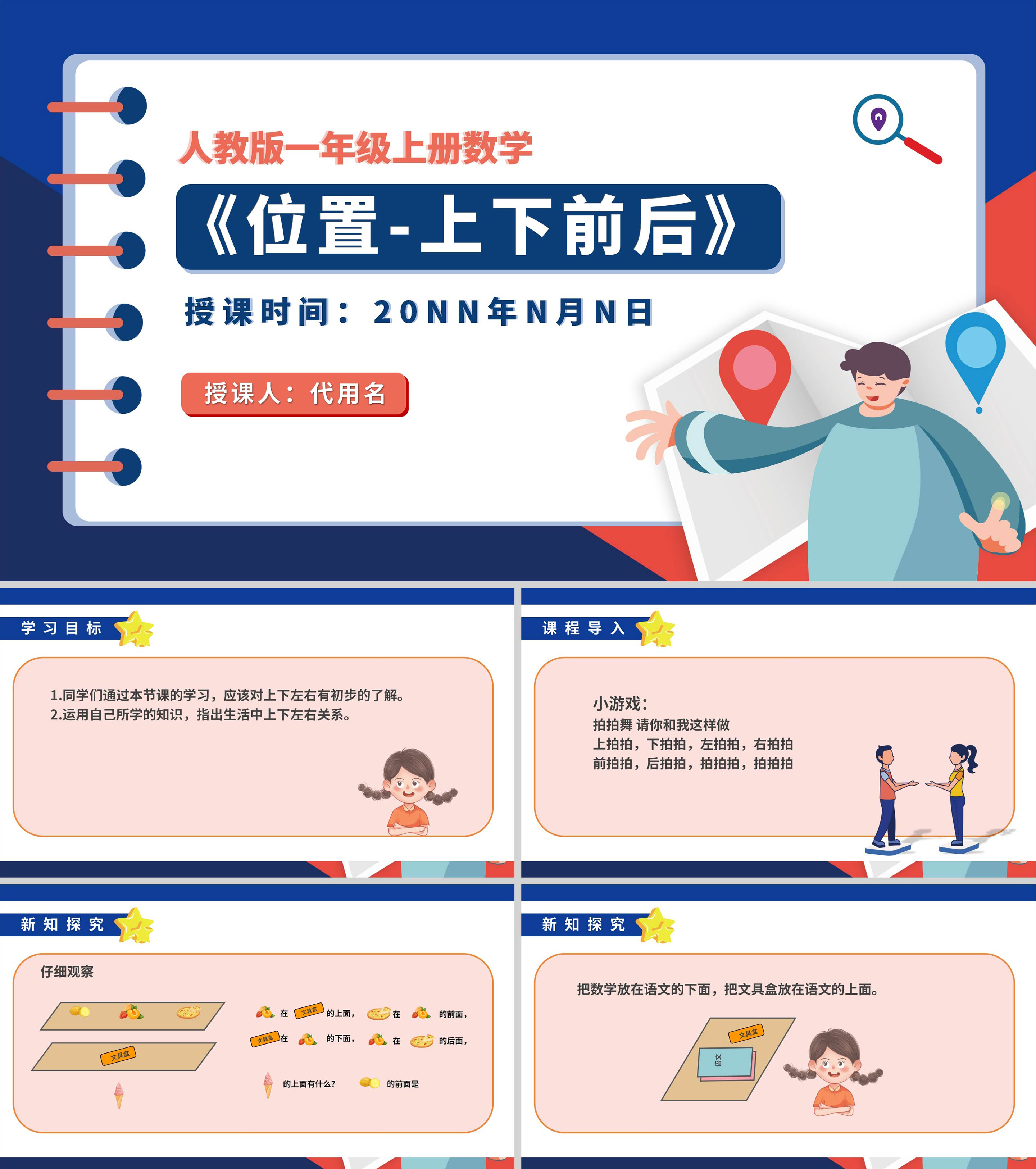 卡通记事本一年级数学《位置》课件PPT模板