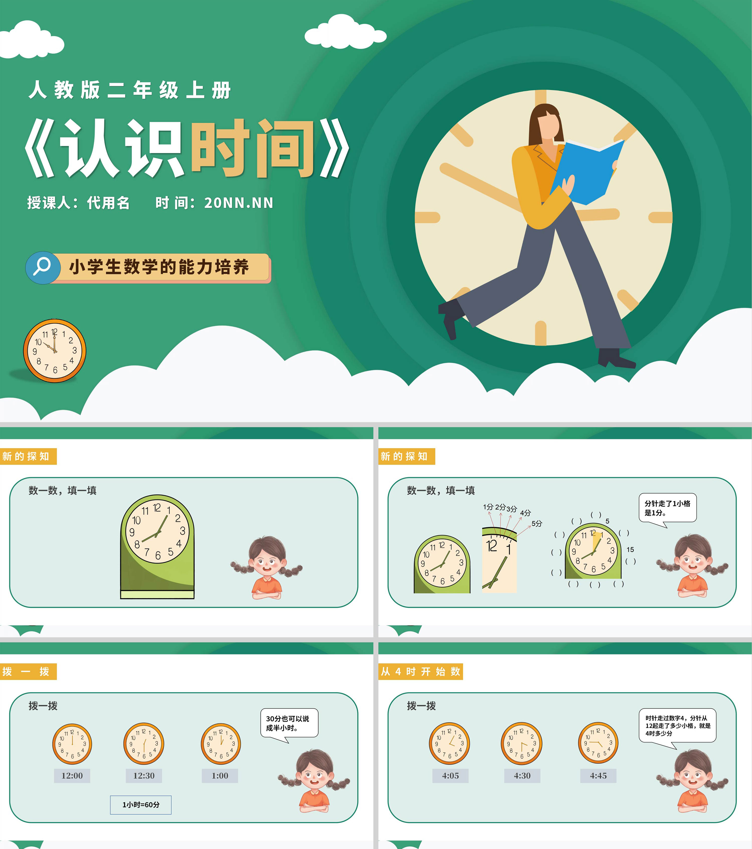 卡通绿色二年级《认识时间》课件PPT模板
