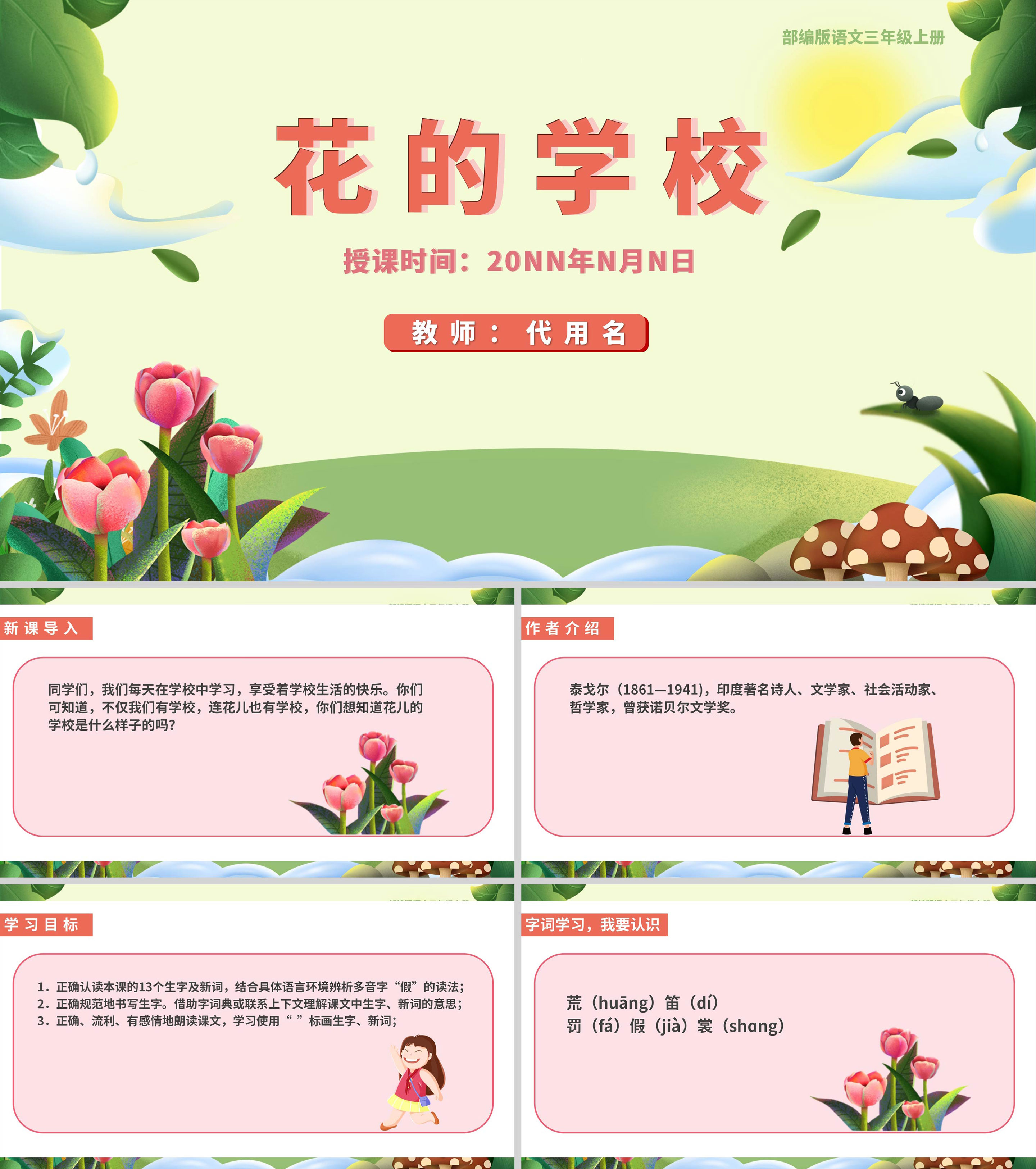 清新卡通语文三年级《花的学校》课件PPT模板
