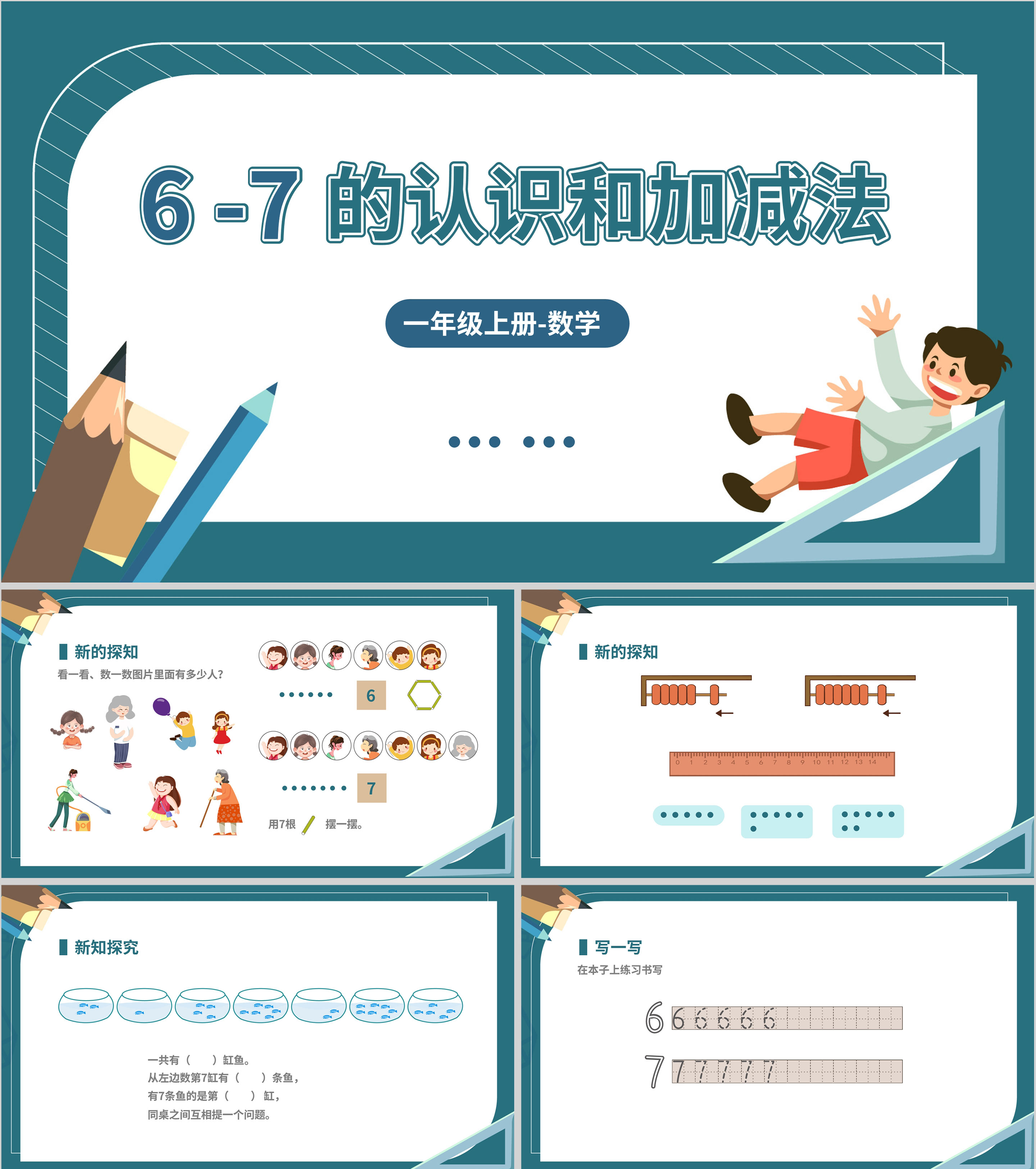 卡通一年级数学《数字的认识与加减法》课件PPT模板