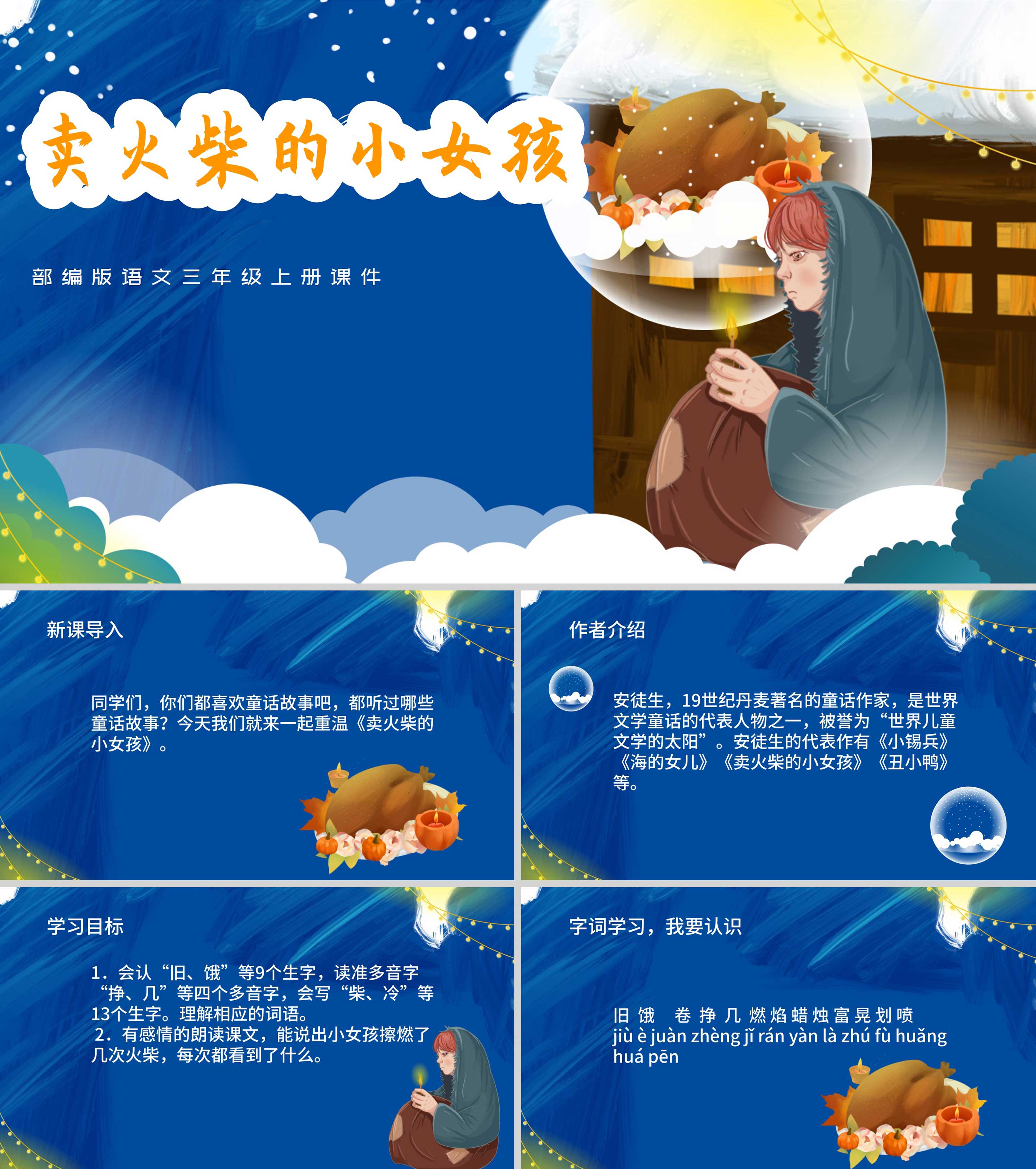 蓝色插画风三年级语卖火柴的小女孩PPT课件