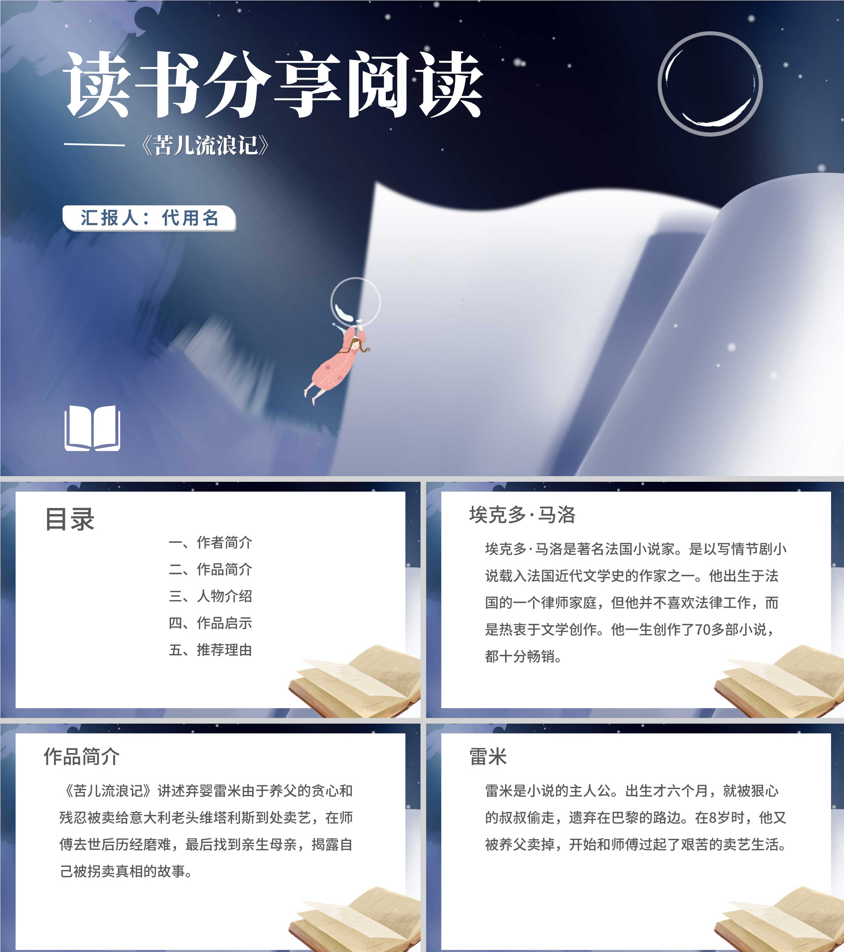蓝色插画风读书分享苦儿流浪记PPT课件