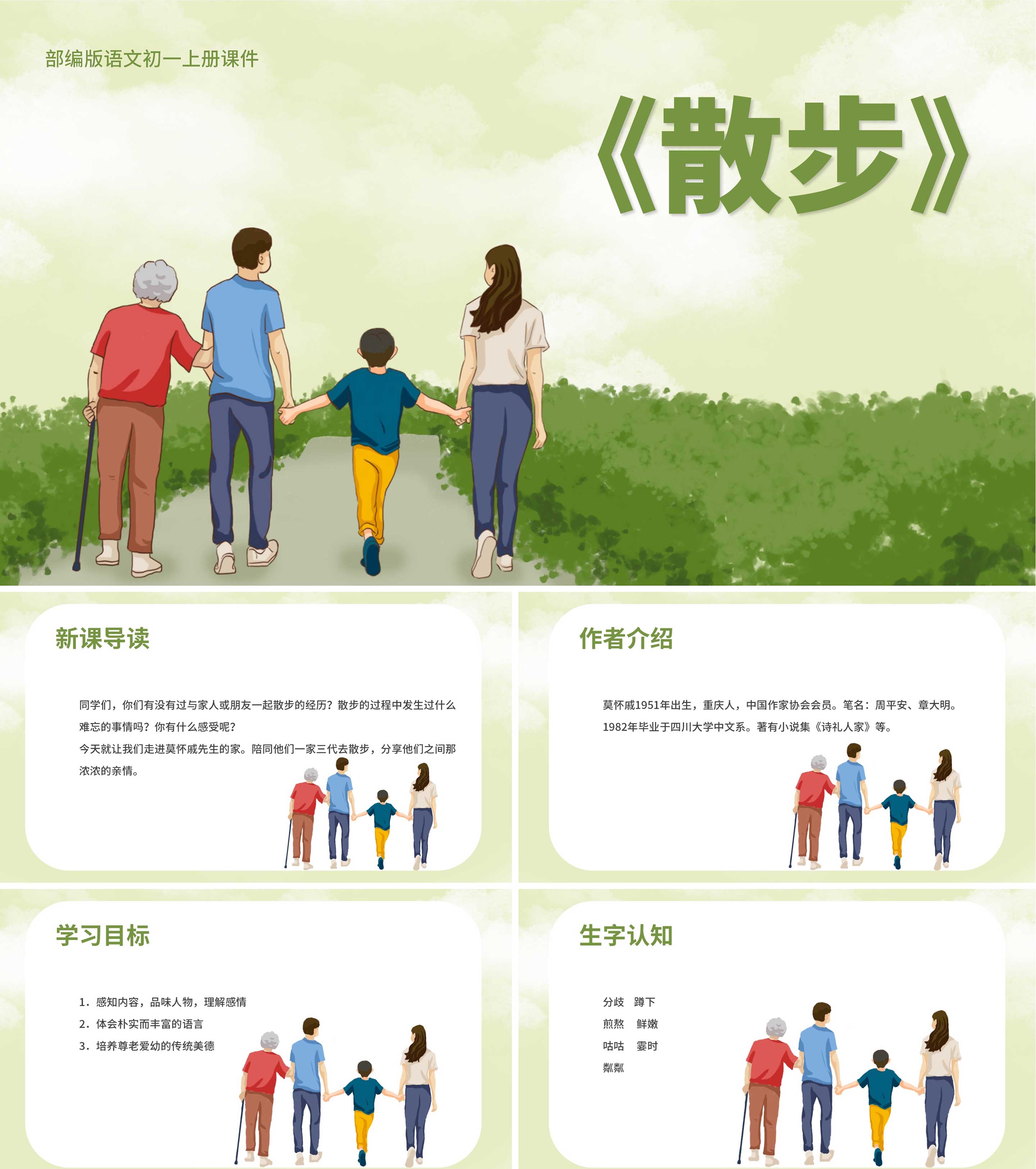 绿色插画风语文初一散步教学课件PPT模板