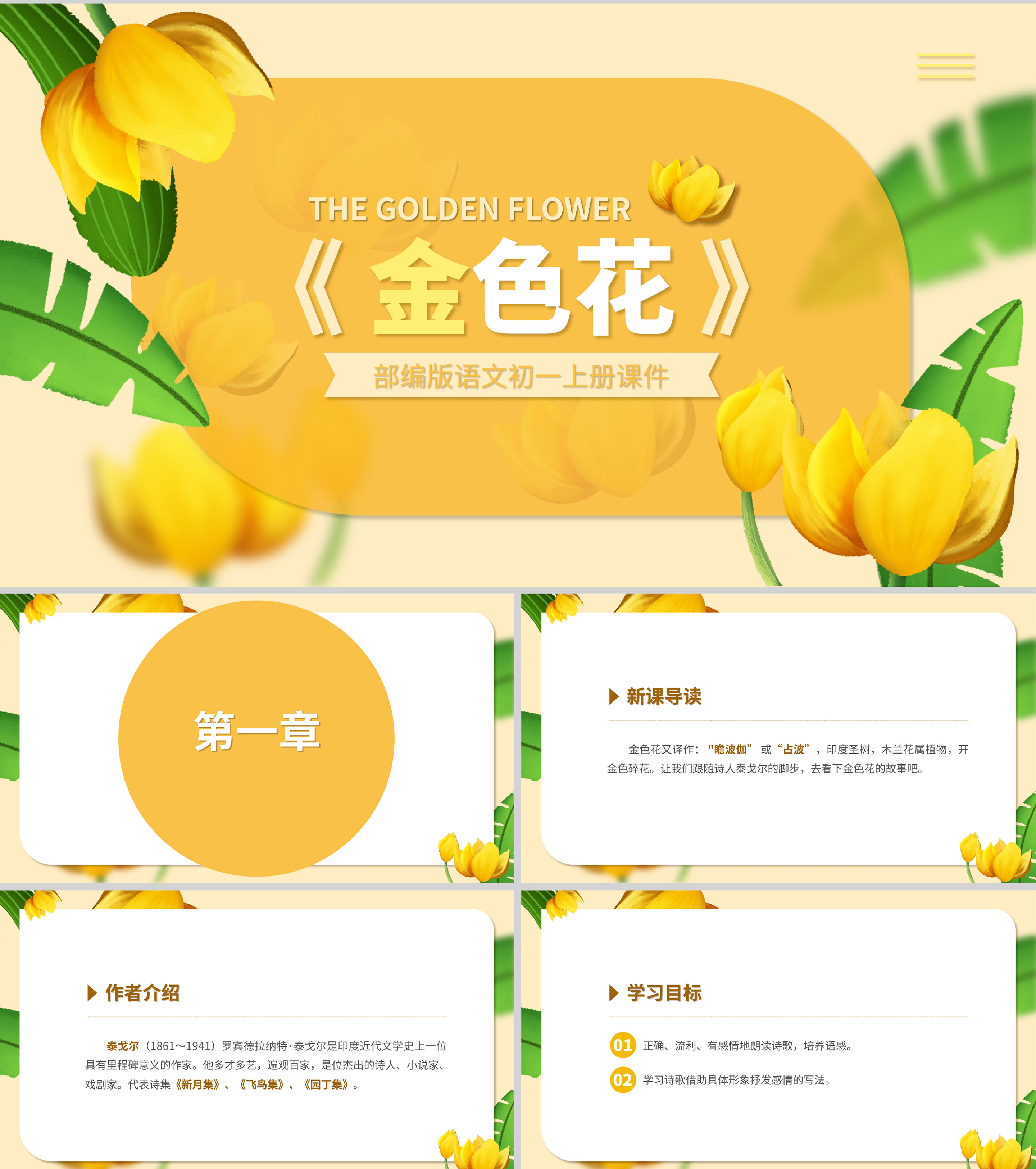 黄色插画风语文初一金色花课件PPT模板