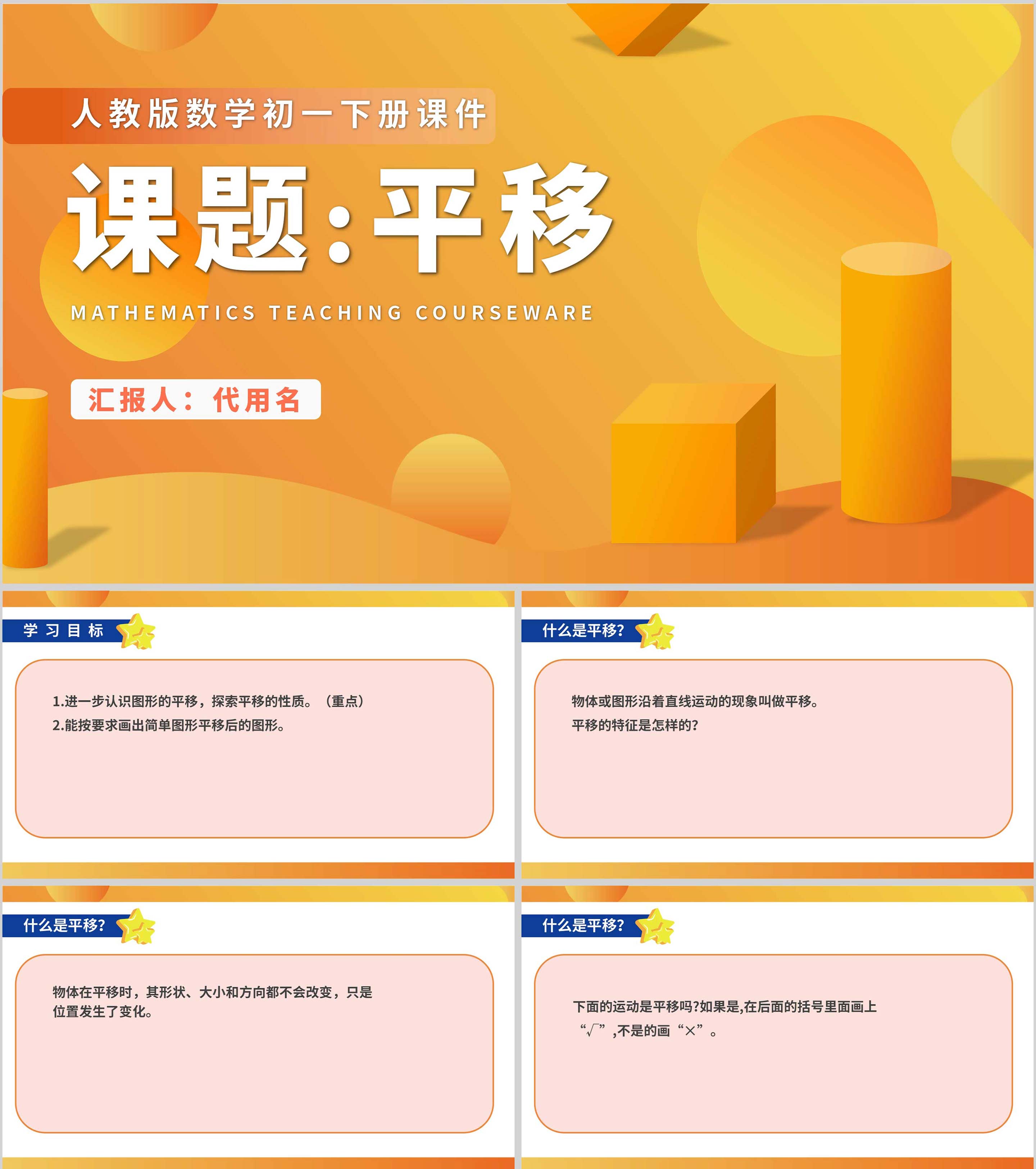 黄色微立体初一数学平移课件PPT模板