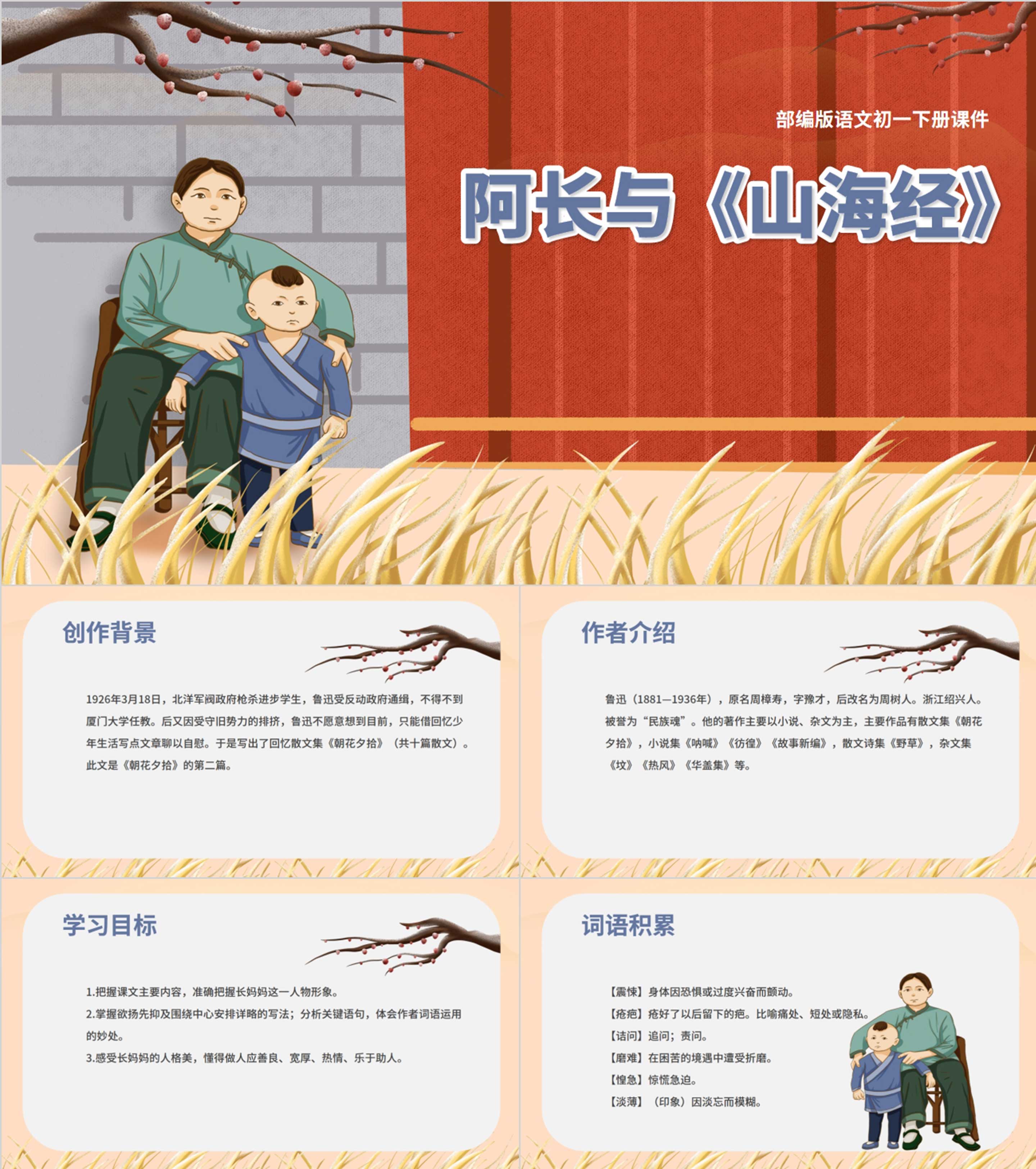 红色中国风初一语文阿长与山海经PPT课件